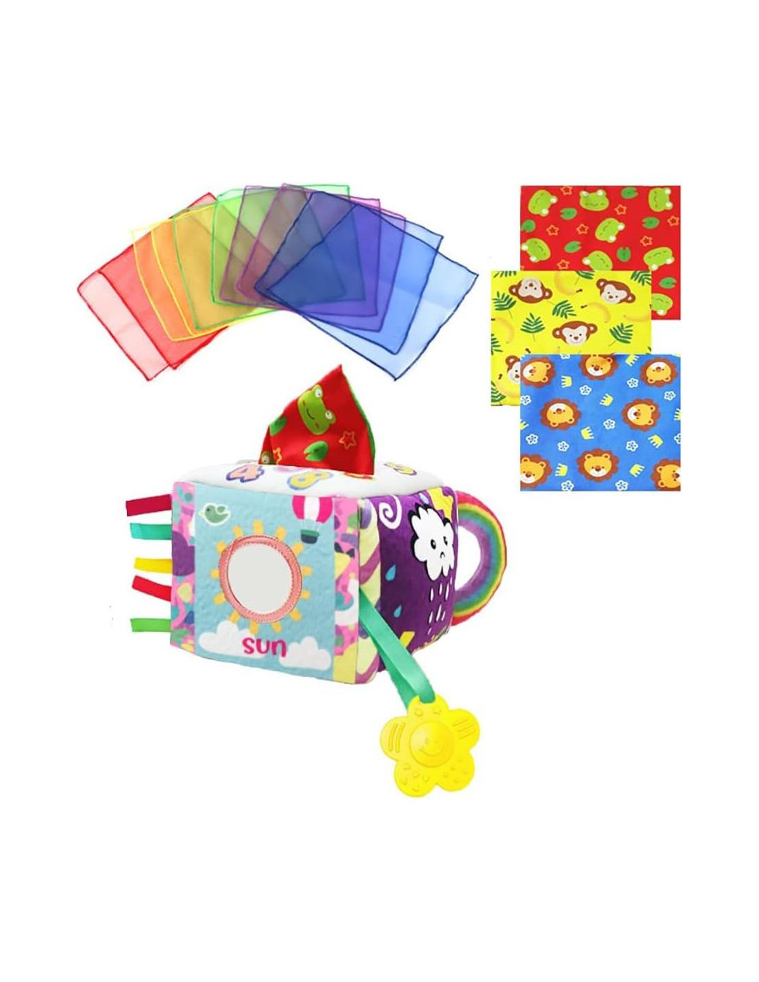- Juguete Interactivo de Caja de Pañuelos para Bebés - Este juguete de tirón de pañuelos para bebés incluye una caja de pañuelos suave, 3 pañuelos con sonido crujiente y 10 bufandas de seda para diversión interminable. Mejora las habilidades motoras finas y la coordinación mano-ojo mientras mantiene a los bebés entretenidos.