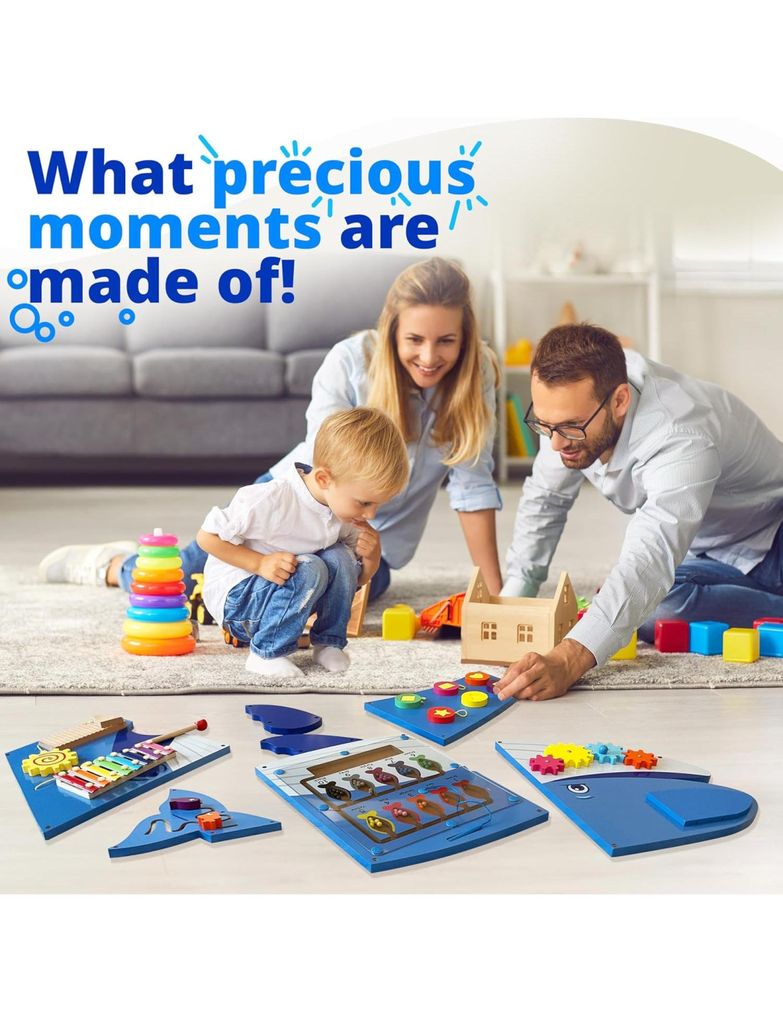 - CRECER, JUGAR, DESCUBRIR! Diseñada para todas las etapas del desarrollo, nuestra ballena sensorial de pared cuenta con juguetes para habilidades motoras finas y gruesas, música, reconocimiento de formas, colores y más, apoyando el aprendizaje de tu hijo en cada paso del camino.