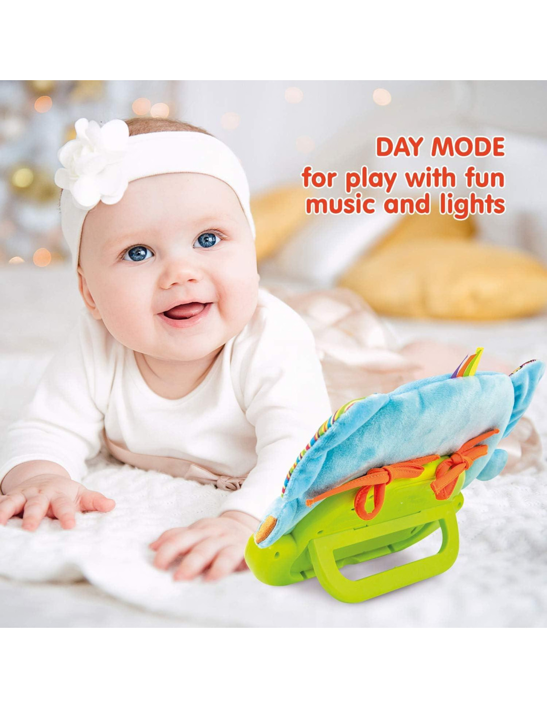 - MODOS DE DÍA, NOCHE Y APAGADO - Cambia al modo 'día' para una brillante y alegre exhibición de luces y sonidos, cambia al modo nocturno para una suave canción de cuna y un suave resplandor de luz nocturna, o apaga completamente el espectáculo de sonido y luz para un juego tranquilo.