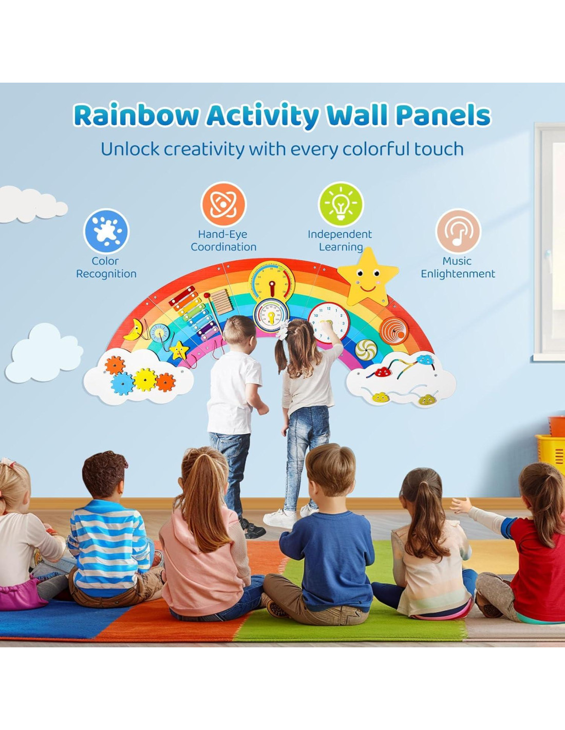 - Diseño Arcoíris Atractivo. El conjunto de juguetes de panel de pared cuenta con un diseño arcoíris único y vibrante que no solo capta la atención de los niños, sino que también añade un toque alegre y colorido a cualquier área de juego, convirtiéndolo en una adición encantadora para hogares, escuelas y salas de espera.