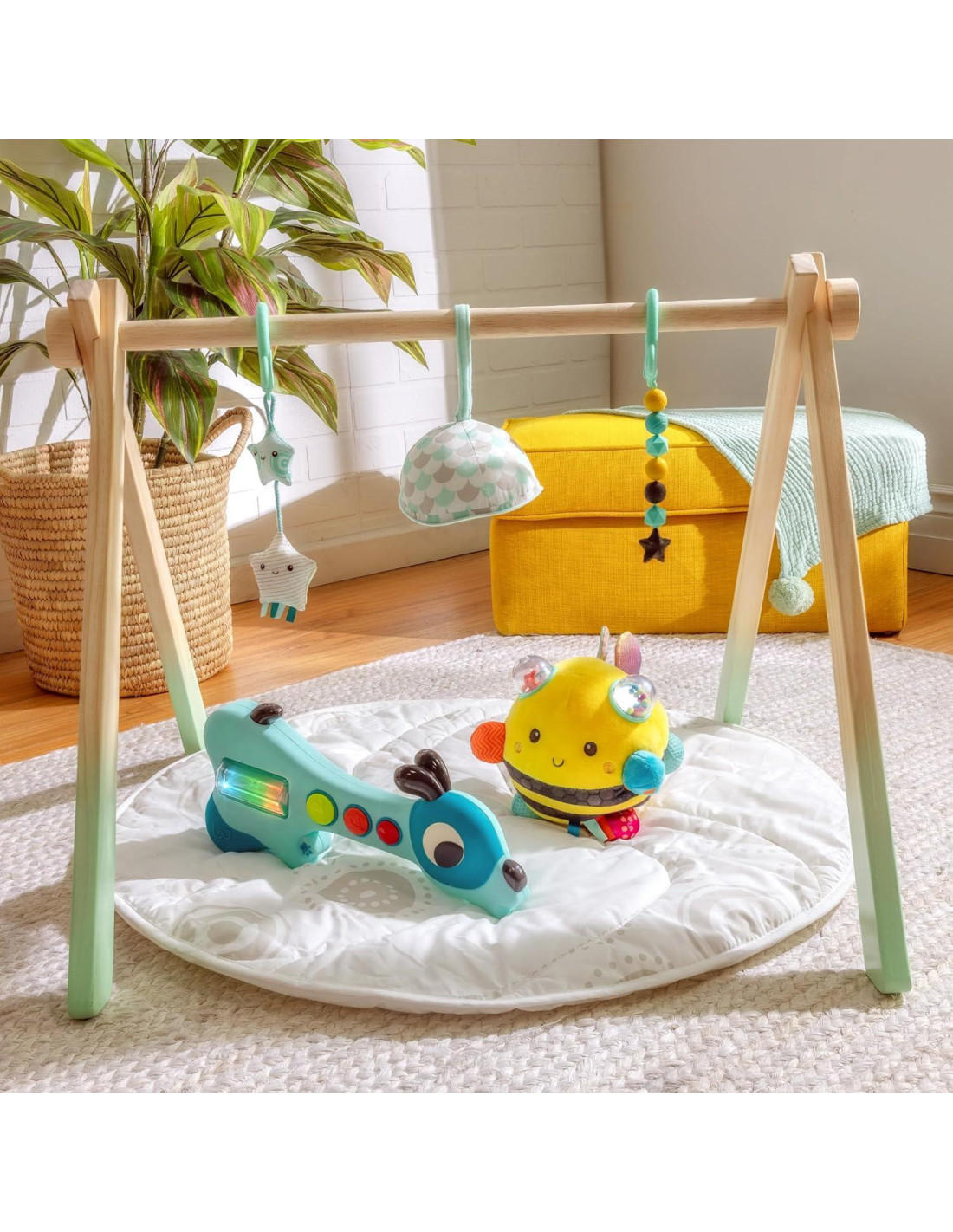Un zumbido aquí, un crujido allá, la diversión sensorial está en todas partes con la Abeja Fuzzy Buzzy de B. baby! Este animal de peluche interactivo viene con un montón de características divertidas para que los bebés exploren. Tira de la flecha para ver cómo esta abeja bultosa se mueve, sacude a este pequeño bicho para escuchar su sonajero, o toca sus alas para hacer que crujan! La Abeja Fuzzy Buzzy es suave, esponjosa y viene con bultos y cintas coloridas para que los más pequeños toquen y sientan. Todos sus colores, patrones, texturas y sonidos están seguros de desarrollar habilidades visuales, táctiles y auditivas! Y porque en B. tenemos en cuenta el medio ambiente, los padres también estarán felices de saber que nuestro empaque es 100% reciclable. Recomendado para recién nacidos y bebés.