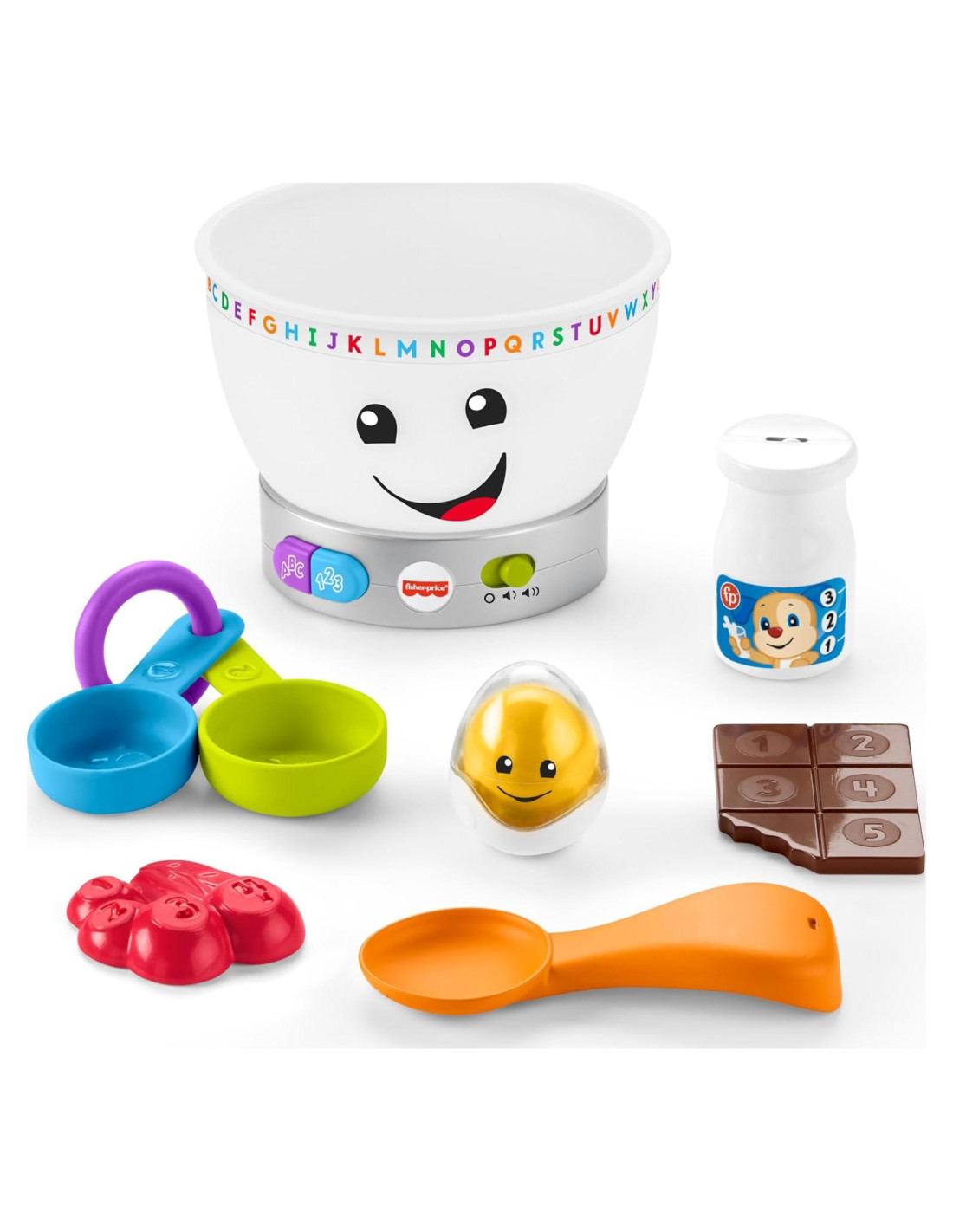 ¡Tu bebé puede mezclar muchas delicias de juego de simulación con el Tazón Mágico de Mezcla de Colores Ríe y Aprende! Este tazón de mezcla musical que se ilumina 'mágicamente' sabe cuándo los pequeños panaderos colocan los ingredientes dentro y recompensa cada acción de poner y sacar con luces coloridas, música, sonidos y frases de aprendizaje. Con seis piezas de juego 'ingredientes' removibles, dos botones que activan más canciones y sonidos divertidos, y una adorable cara que se ilumina, ¡este dulce juguete de hornear es deliciosamente divertido!