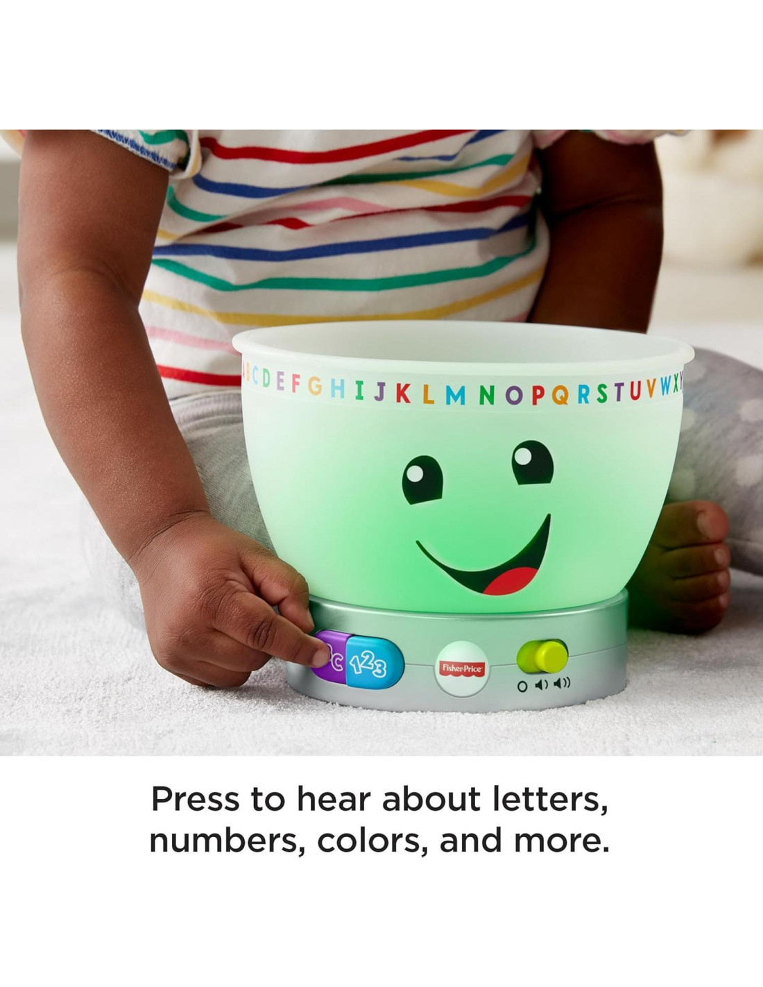 ¡Tu bebé puede mezclar muchas delicias de juego de simulación con el Tazón Mágico de Mezcla de Colores Ríe y Aprende! Este tazón de mezcla musical que se ilumina 'mágicamente' sabe cuándo los pequeños panaderos colocan los ingredientes dentro y recompensa cada acción de poner y sacar con luces coloridas, música, sonidos y frases de aprendizaje. Con seis piezas de juego 'ingredientes' removibles, dos botones que activan más divertidas canciones y sonidos, y una adorable cara que se ilumina, ¡este dulce juguete de hornear es deliciosamente divertido!