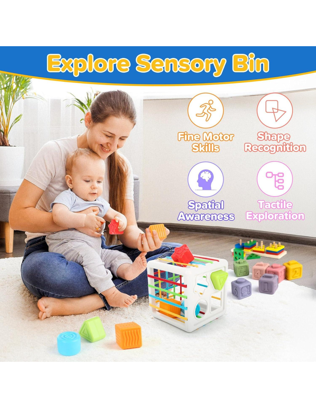 - Caja Sensorial y Juguete Giratorio Divertido: Despierta la curiosidad deslizando los 4 bloques gruesos a través de la banda elástica del cubo para explorar sus diferentes texturas y formas; La potente ventosa del Juguete Giratorio puede adherirse bien a superficies planas y lisas, como mesas de comedor, sillas altas, bañeras, ventanas de automóviles, etc. Produce un sonido nítido al girar y puede usarse como juguete de baño o juguete de viaje para bebés; ya sea en interiores o exteriores, entretenimiento sin esfuerzo para bebés de 6-12 meses