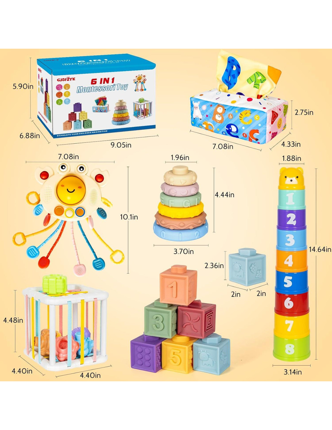- SET DE JUGUETES SENSORIALES MONTESSORI 6 EN 1: Nuestros 38 piezas individuales para juguetes de bebé de 0-6-12-18 meses y más vienen con 8 PCS de caja de tejidos, 6 bloques de diferentes colores, 9 PCS de tazas apilables, 7 PCS de juguete clasificador de cubos, 6 anillos apilables suaves, un juguete de cuerda para tirar y una bolsa de almacenamiento. ¡El paquete perfecto para horas incontables de diversión!
