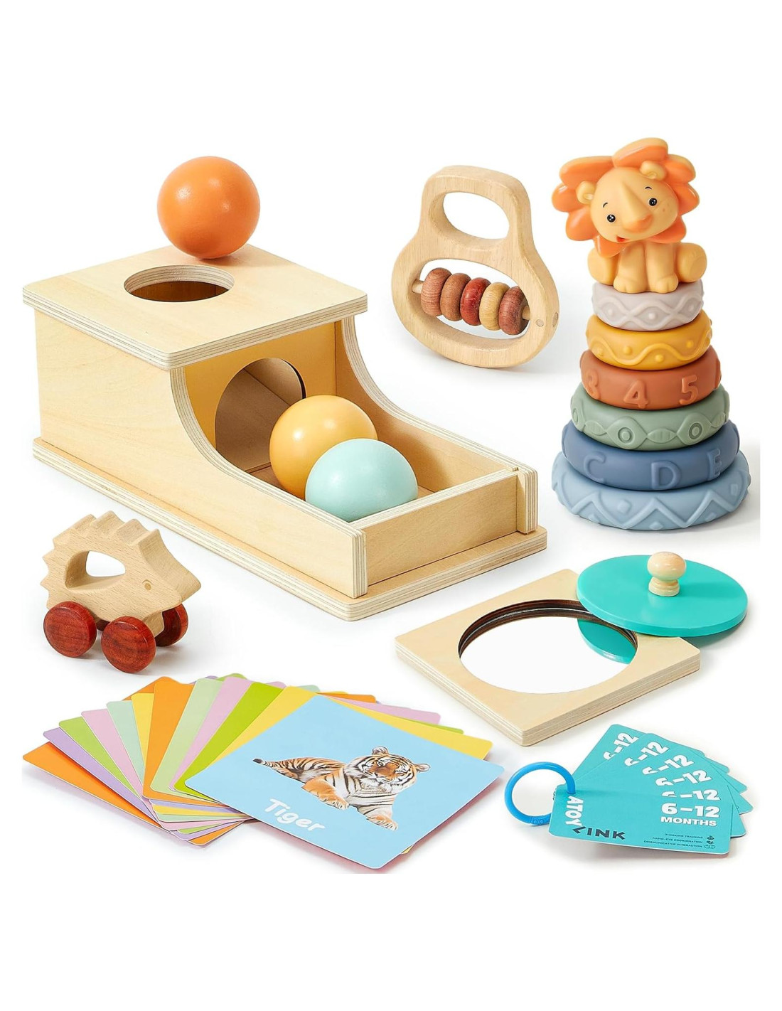 - 6 en 1 Juguetes Montessori para Bebés: Este set de juguetes para bebés contiene seis juguetes Montessori, incluyendo una caja de permanencia de objetos con 3 bolas de diferentes colores, un rompecabezas de perilla con espejo, siete anillos de apilamiento coronados con cachorros de león, un coche erizo, un sonajero y tarjetas de flash. Nuestros juguetes educativos pueden brindar una rica experiencia sensorial a los niños, mejorar la capacidad cognitiva de los niños y convertirse en un hermoso compañero para el crecimiento de los niños.
