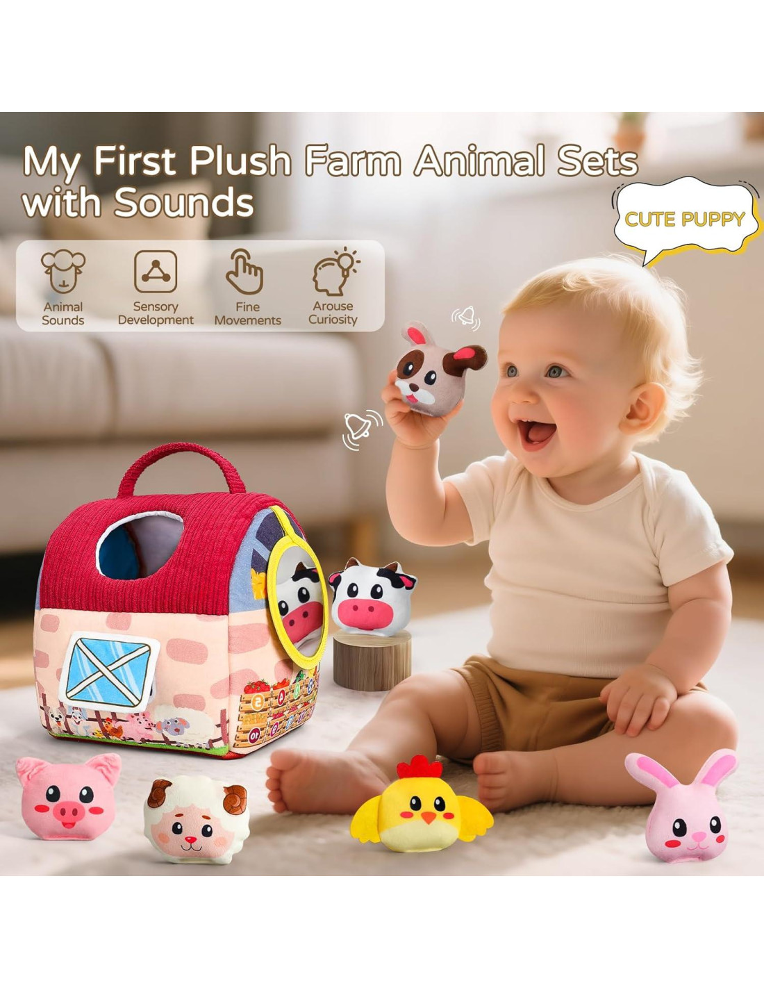 - Juguetes Multi-Sensoriales - La investigación ha encontrado que los niños de 0 a 2 años son muy importantes para la elección de juguetes sensoriales. Por eso diseñamos este juguete de granja no solo para el reconocimiento auditivo de los niños a través de los agradables sonidos de sonajero y timbre de algunos animales, sino también para promover el desarrollo visual y la percepción táctil de los niños a través del establo de peluche de colores brillantes. Además, el espejo lateral del establo se convierte en un portal para el autodescubrimiento, fomentando la autoconciencia y encendiendo momentos de alegría.