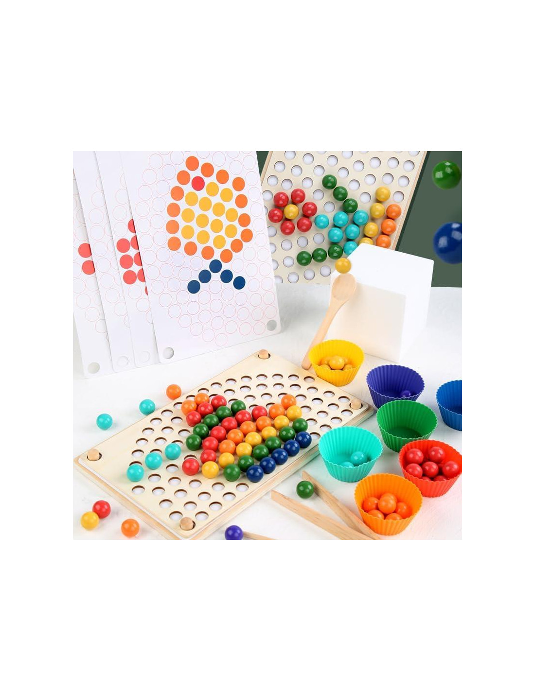 Descubre la Alegría de Aprender con el Conjunto de Habilidades Prácticas Montessori de EduLand! Introduce a tu hijo en el aprendizaje práctico con nuestro versátil conjunto que incluye esponjado, palillos, pinzas y un juego de perlas en tablero de madera. Diseñado para edades de 3 a 6 años, este conjunto incluye divertidos patrones de arcoíris, flores y peces que despiertan la creatividad y la curiosidad. Desarrolla Habilidades Motoras Finas y Reconocimiento de Colores: Con colores vibrantes y llamativos, los niños desarrollan habilidades de reconocimiento y clasificación de colores mientras mejoran su destreza. Participar en estas actividades de vida práctica fomenta la independencia y la concentración a través del juego intencionado. Promueve la Concentración y la Coordinación: Cada tarea, desde recoger perlas hasta colocar clavijas, fortalece la coordinación mano-ojo y nutre la capacidad de atención. Alineado con los principios Montessori, este conjunto promueve un aprendizaje tranquilo y estructurado. Seguro, Duradero y Alineado con Montessori: Hecho de madera natural y recubierto con pintura no tóxica a base de agua, nuestros juguetes son suaves, resistentes y están hechos para durar. El conjunto está certificado por CPC en los EE. UU., asegurando los más altos estándares de seguridad para tu pequeño aprendiz. Inspira Independencia y Confianza: A través de la prueba y el descubrimiento, los niños obtienen un sentido de logro a medida que dominan cada tarea. Esto promueve la autoestima y un amor por el aprendizaje que dura toda la vida. Regalo Perfecto para Mentes Curiosas: Ideal para cumpleaños, festividades o juego educativo en casa o en el aula, el Conjunto Montessori de EduLand hace que aprender sea alegre y significativo.