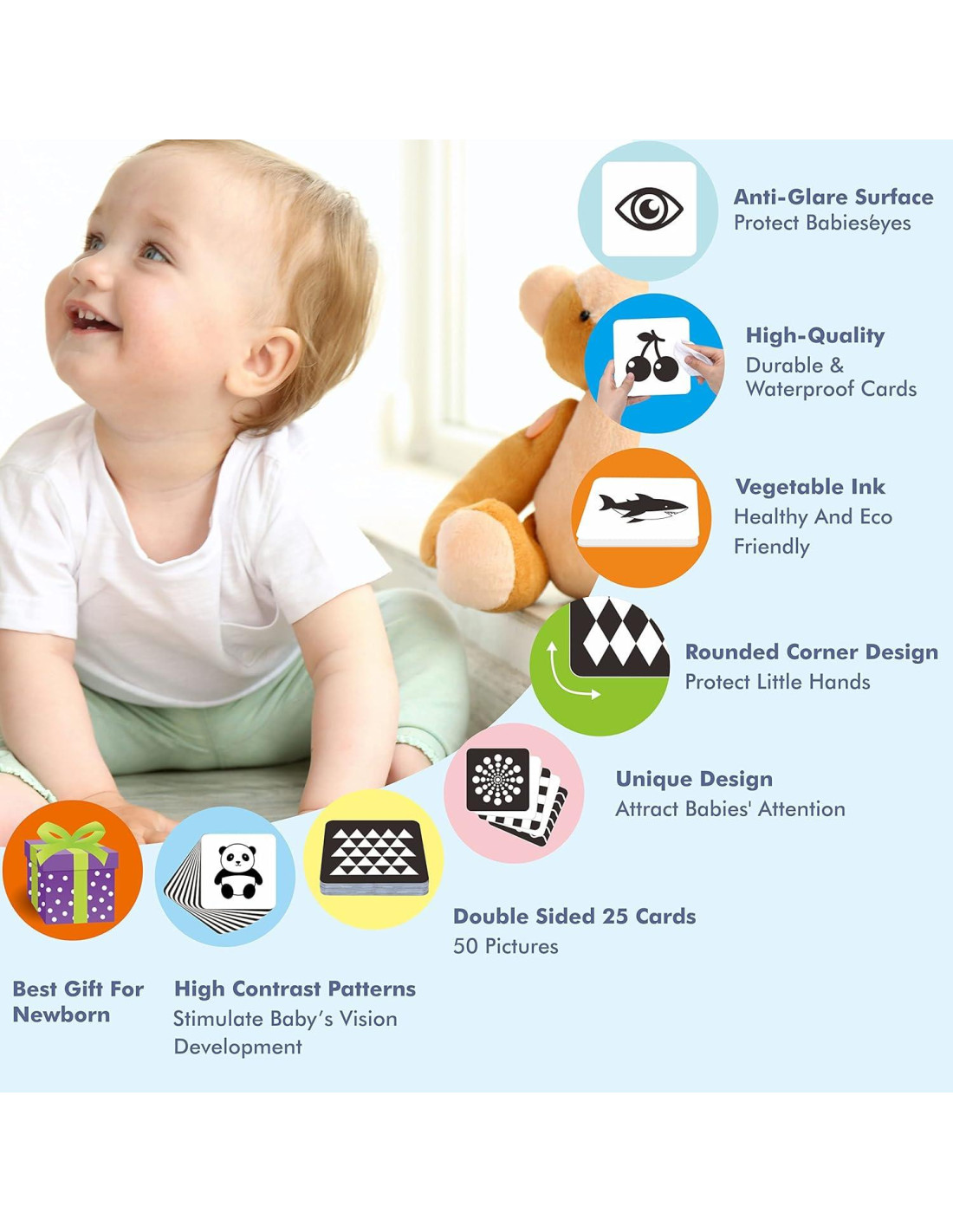 - Regalo Ideal: El desarrollo cerebral es vital para el crecimiento de los bebés, estas tarjetas de estímulo visual en blanco y negro de alto contraste juegan un papel importante en el desarrollo cognitivo. Es perfecto como regalo de cumpleaños, vacaciones para recién nacidos e infantes.
