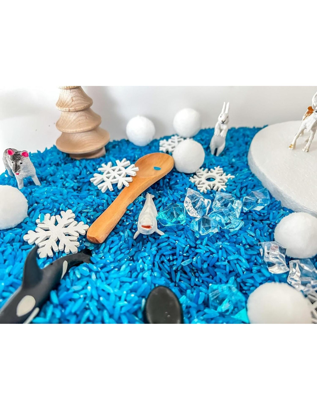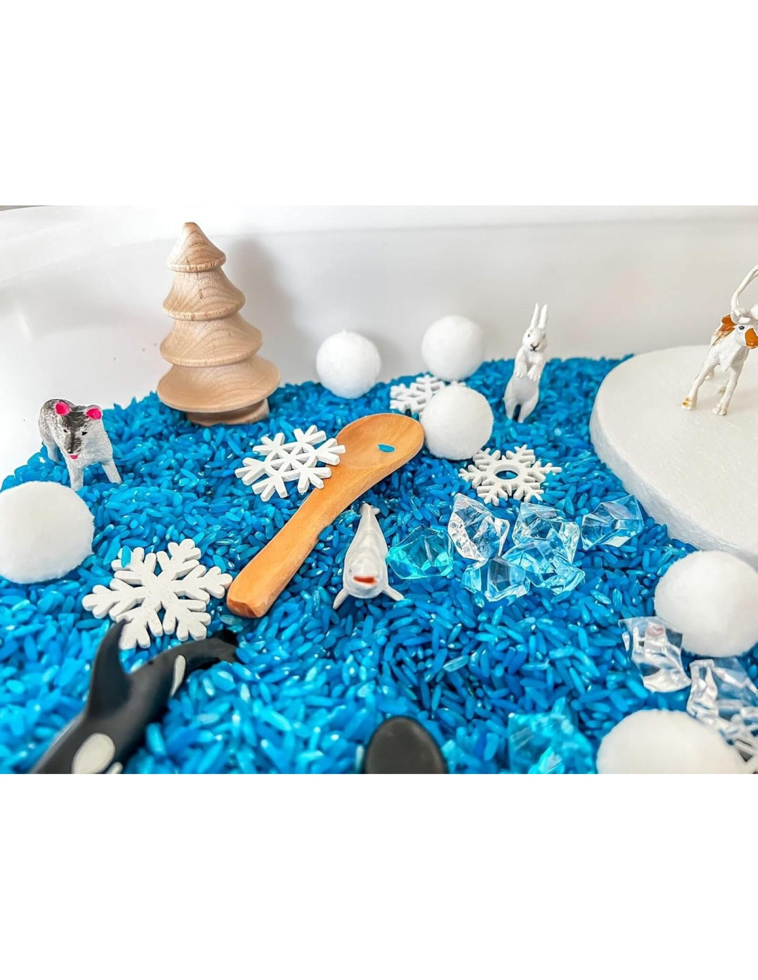 - ¿QUÉ INCLUYE ESTE JUEGO?: 6 Tazas de Arroz Azul (agua), 1 conjunto de animales árticos, 10 copos de nieve de madera, 15 gemas azules y transparentes mezcladas, 10 bolas de pom pom blancas (bolas de nieve), 1 disco de espuma de 6" (flotador de hielo), 1 cubo de madera, 1 cuchara redondeada de madera, 1 cuchara de madera, bolsas con cordón para guardar todo. ¡LA BANDEJA SENSORIAL NO ESTÁ INCLUIDA EN ESTE JUEGO!