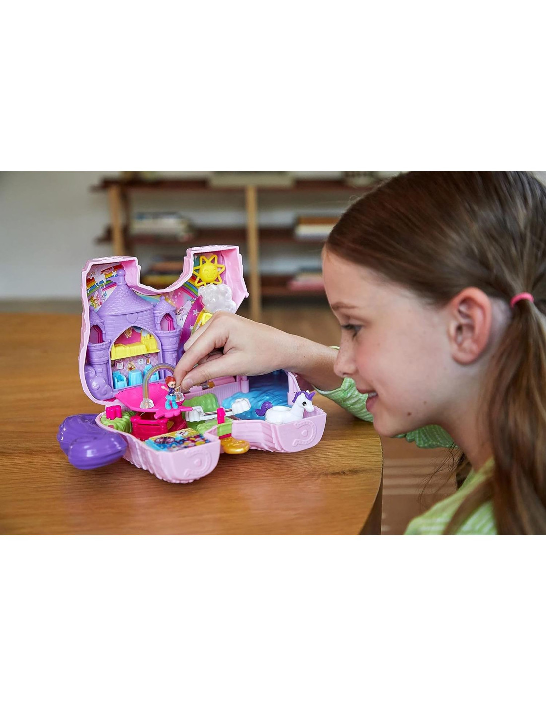 - Otros accesorios son muy divertidos para colocarlos dentro y fuera del juego de Polly Pocket, incluyendo unicornios y carroza, dragón, columpios, puesto de globos, tiaras, faldas y más.