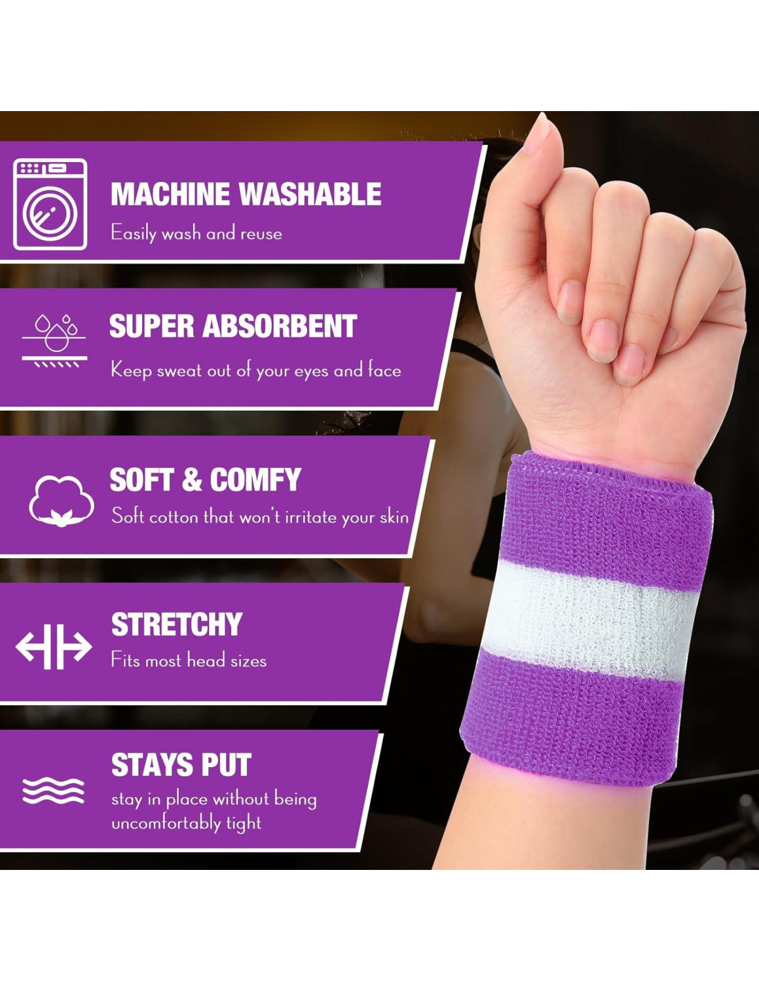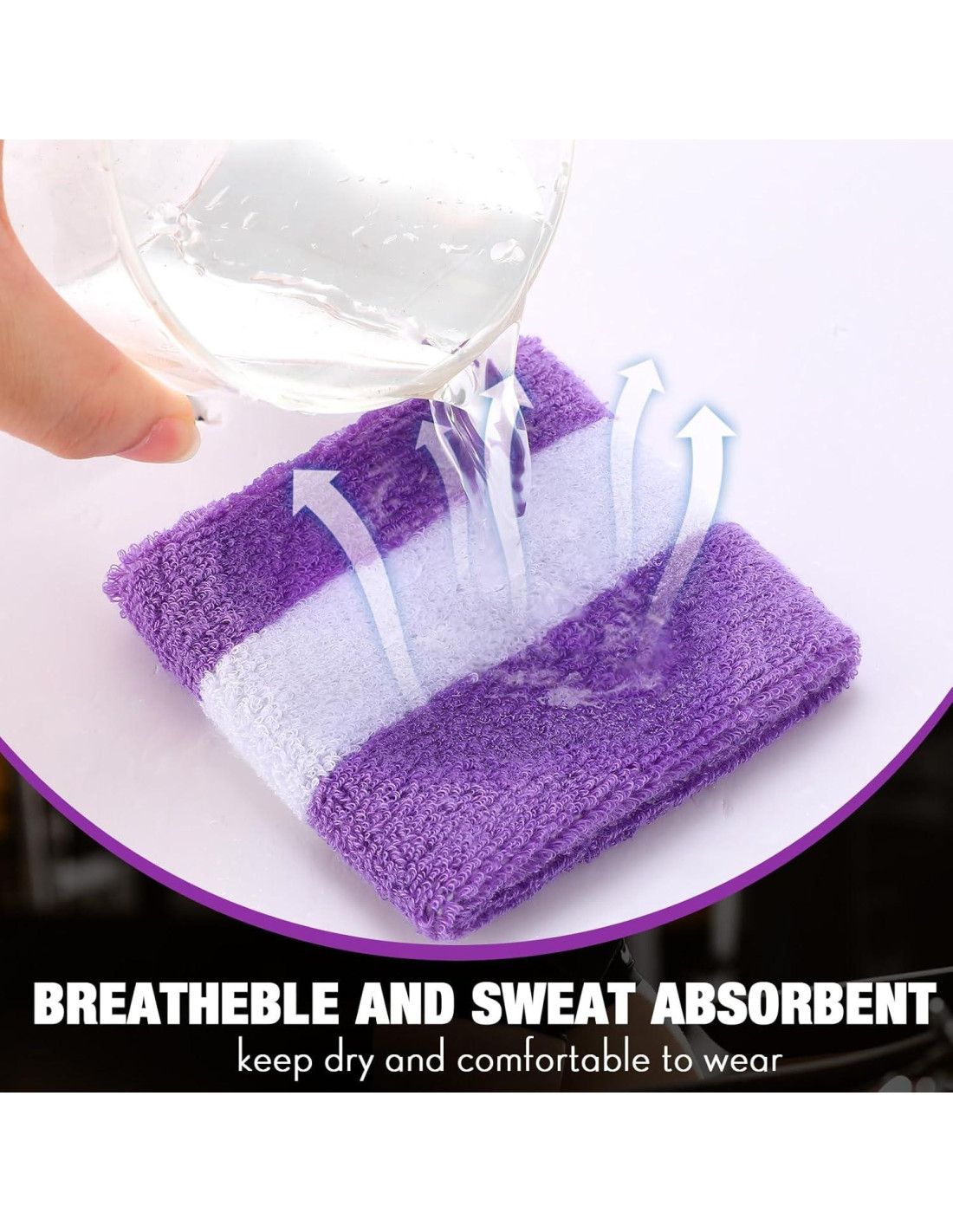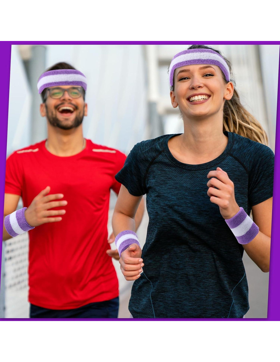 - Talla Única para la Mayoría de las Personas: cada diadema mide aproximadamente 5 x 18 cm (1.97 x 7.09 pulgadas), y cada muñequera mide aproximadamente 8 x 8 cm (3.15 x 3.15 pulgadas), con buena elasticidad; Nuestras diademas y muñequeras moradas y blancas son adecuadas para la cabeza y muñeca de la mayoría de los adultos, ideales tanto para hombres como para mujeres