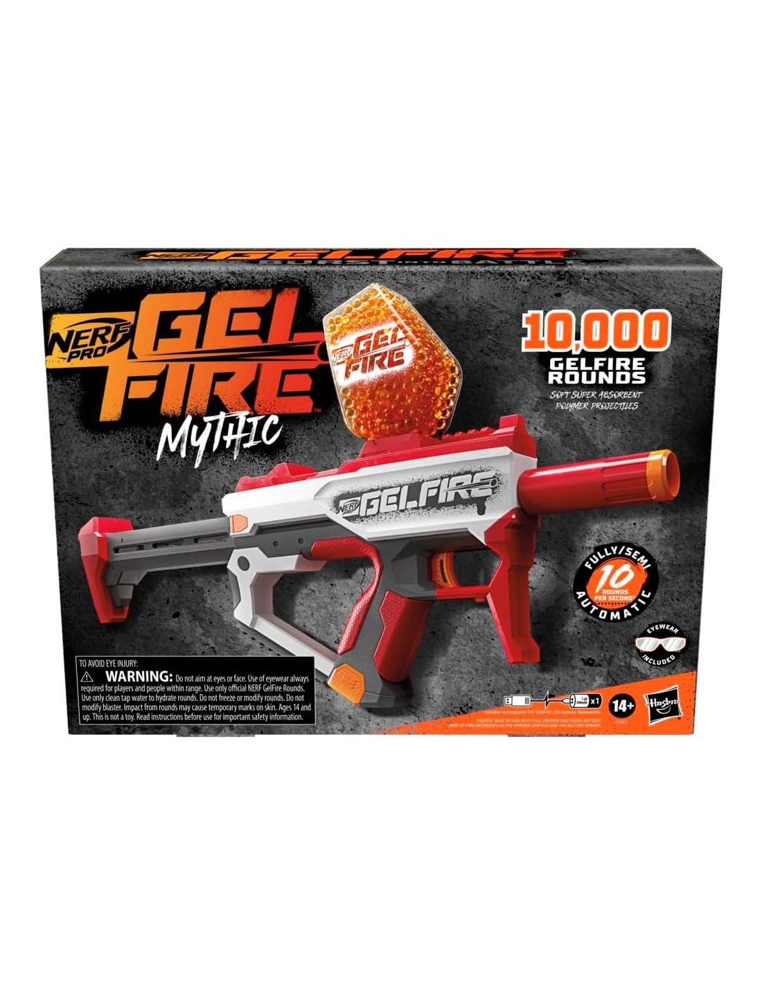 ¡Entra en batalla con los blasters Nerf Pro Gelfire que cuentan con balas hidratadas que estallan al impacto! Estos blasters de gran capacidad ofrecen un rendimiento de disparo de alto nivel para encender tu ventaja competitiva. Las balas Nerf Pro Gelfire vienen deshidratadas en la caja, dándote una gran cantidad de balas. Agrega agua para hidratar las balas y prepararlas para su uso. Las balas hidratadas se disparan desde el blaster a alta velocidad y estallan al golpear un objetivo. ¡No es necesario recoger las balas! El blaster Nerf Pro Gelfire Mythic completamente automático incluye una tolva de alta capacidad de 800 balas y 10,000 proyectiles de polímero superabsorbente suave Nerf Pro Gelfire deshidratados. El diseño innovador del blaster combina calidad excepcional y estilo. Tiene modos automático completo y semiautomático, cañón removible, culata extensible, gafas protectoras, batería recargable de fácil inserción y extracción, y cable de carga universal USB-A a USB-C. Se requiere cargador de pared USB-A, no incluido. Se recomienda uso al aire libre. Para edades de 14 años en adelante. Nerf y todas las propiedades relacionadas son marcas registradas de Hasbro.