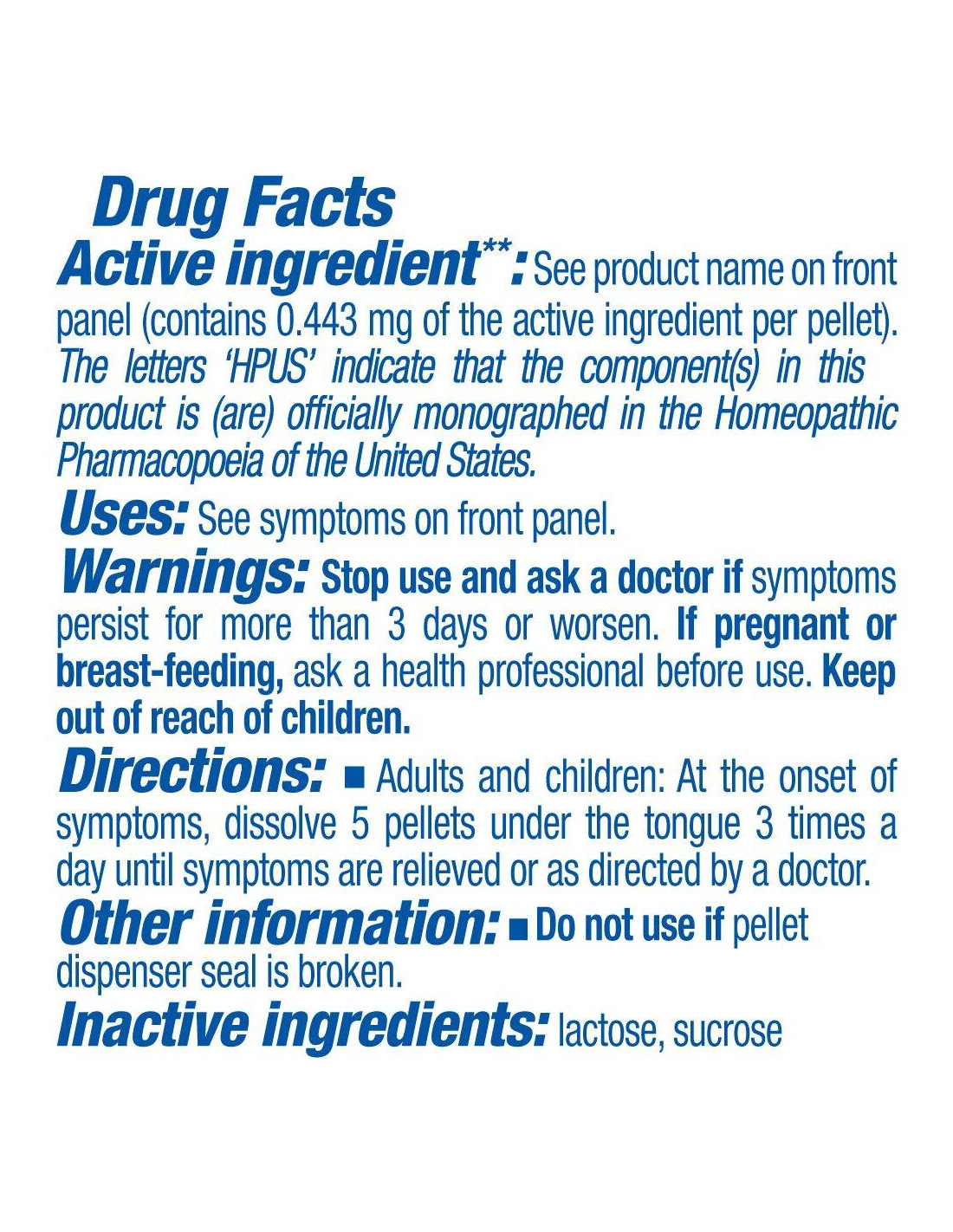 Instrucciones: Dosis: Instrucciones (adultos/niños) Disolver 5 pellets en la boca 3 veces al día hasta que los síntomas se alivien o según lo indique un médico. Instrucciones: ADVERTENCIAS: NO USAR si el sello del dispensador de pellets está roto. DEJAR DE USAR Y CONSULTAR A UN MÉDICO SI los síntomas persisten por más de 3 días o empeoran. SI ESTÁ EMBARAZADA O EN PERÍODO DE LACTANCIA, consulte a un profesional de la salud antes de usar. MANTENER FUERA DEL ALCANCE DE LOS NIÑOS.