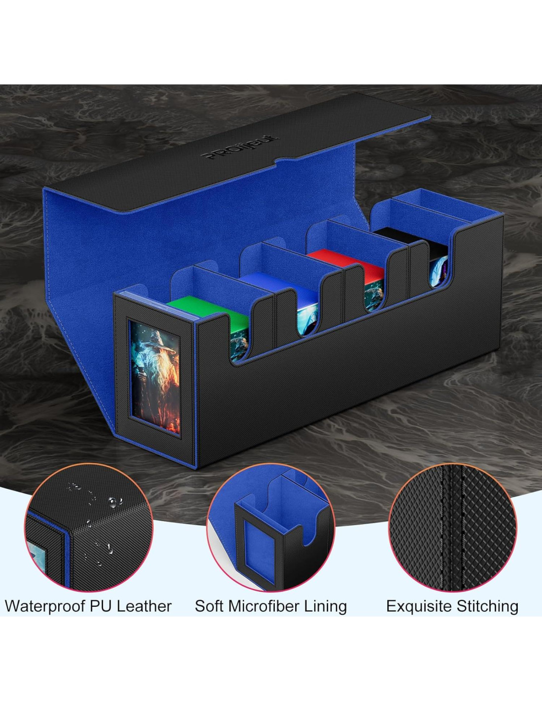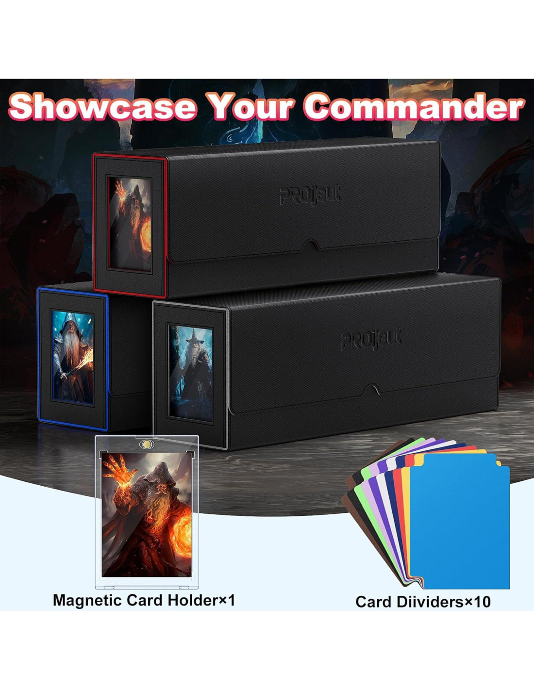 - [Caja de Barajas Premium] La Caja de Barajas Proijeut es un sistema versátil que incluye una caja de barajas con ventana de exhibición, 3 cajas de barajas, una caja de dados/token, una cubierta/mat desmontable, un soporte magnético para cartas y 10 divisores coloridos. Es adecuada para MTG, Yugioh, cartas deportivas y otros tipos de cartas coleccionables, lo que la convierte en un accesorio organizativo ideal para juegos de cartas.