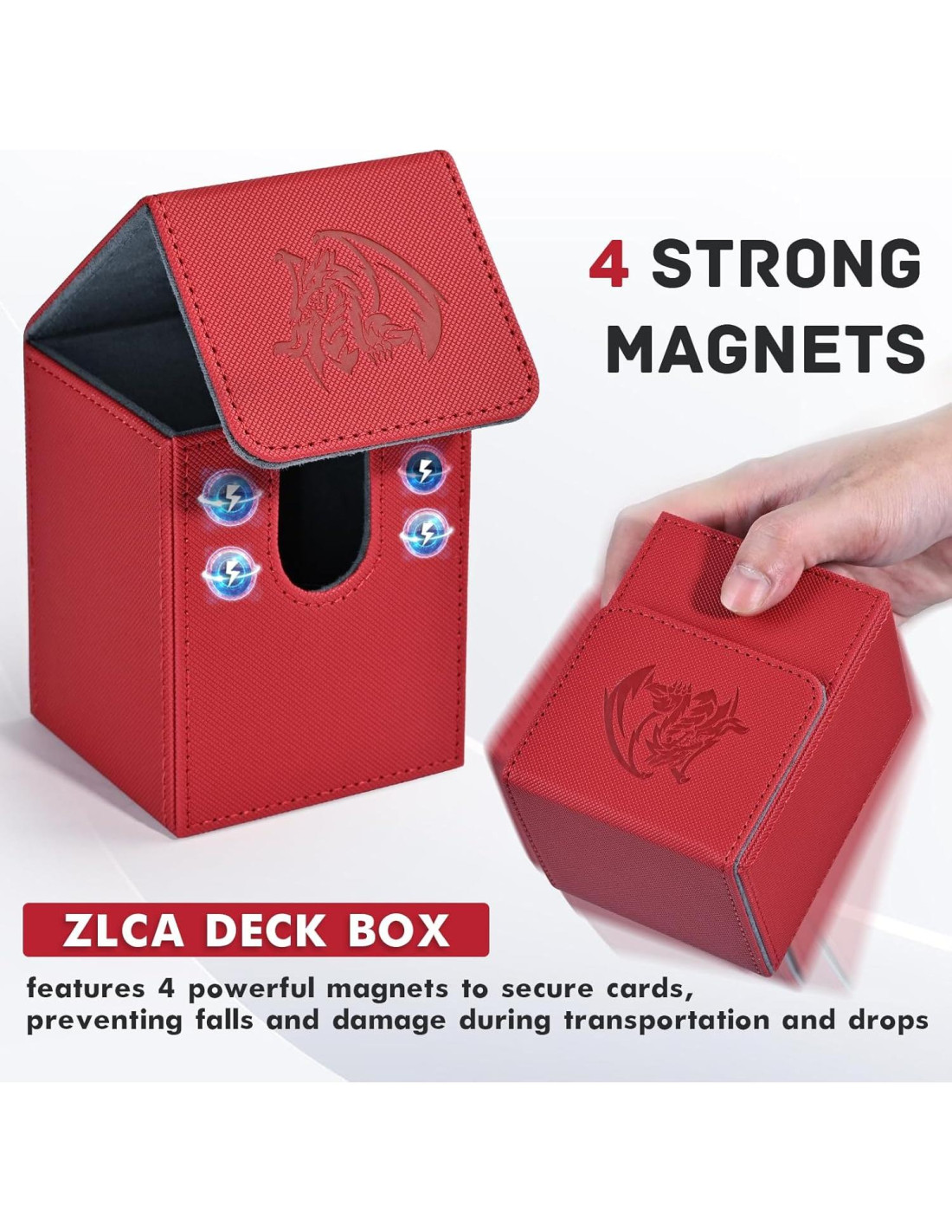 - Costura ajustada, 4 imanes potentes mantienen el soporte de cartas seguro durante el transporte. Incluso cuando está completamente cargado y dado vuelta, la caja de barajas permanece cerrada
