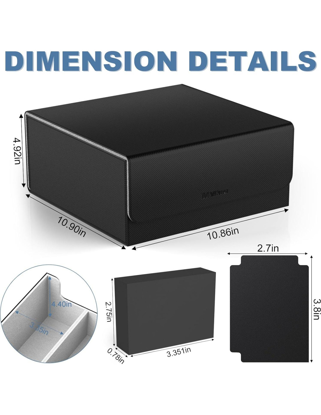 - Capacidad para 1800+ Cartas con Fundas El tamaño de nuestra caja de cartas es 11.5x10x4.2 pulgadas (29,21x25,4x10,67 cm), lo suficientemente grande como para almacenar fácilmente 1800+ cartas con funda simple, 1100+ cartas con funda doble, 2400+ cartas sin funda.