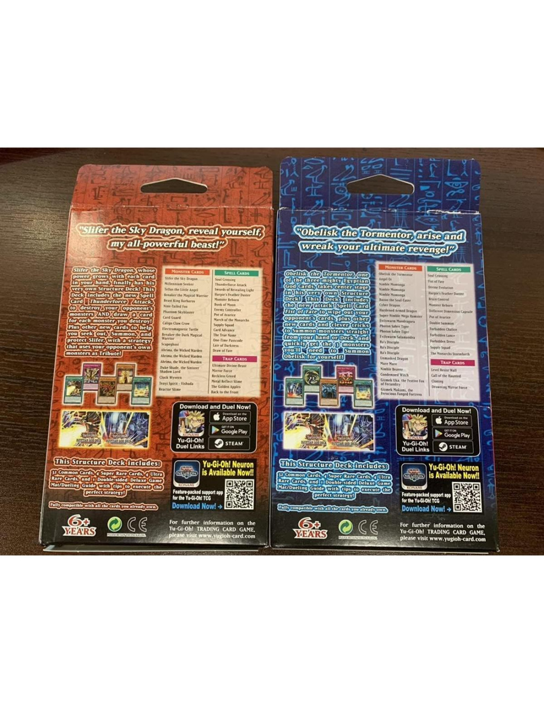 Obelisco el Torturador Desata el verdadero poder de Obelisco el Torturador al tributar 2 monstruos que controlas y eliminar los monstruos de tu oponente del campo! Esta Baraja utiliza monstruos auto-replicantes para proporcionar tributos y proteger tus Puntos de Vida mientras te acercas a robar tu Bestia Divina. La propia habilidad de Obelisco puede aplastar los monstruos de tu oponente de una vez, pero añade la nueva Carta de Hechizo, Puño del Destino, y puedes negar el efecto de un monstruo y destruirlo sin necesidad de tributar. Activa durante tu propia Fase Principal y también puedes aplastar todos los Hechizos y Trampas de tu oponente! Cada Baraja Dios Egipcio tiene un total de 40 cartas e incluye 1 Carta Dios Egipcio y 5 cartas nuevas - 4 cartas nuevas únicas así como 1 copia de Cruce de Almas, una nueva Carta de Hechizo de Juego Rápido incluida en ambas Barajas que te permite invocar a tu Carta Dios Egipcio al tributar los monstruos de tu oponente! Cada Baraja se puede jugar por sí sola directamente de la caja y viene con una Guía de Duelo que explica la estrategia básica y algunas reglas que debes conocer para aprovechar al máximo tu Baraja. Por supuesto, si adquieres ambas, puedes mezclar y combinar sus estrategias para crear una increíble Baraja que pueda manejar múltiples Cartas Dios Egipcias!