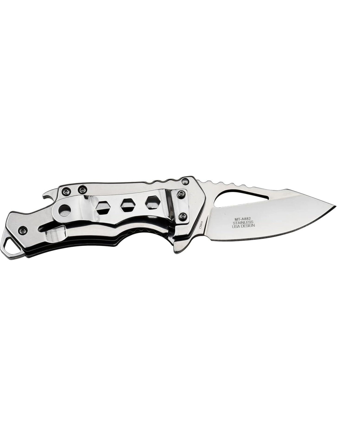 La funcionalidad se encuentra con la moda en el cuchillo asistido por resorte MTech USA! Este cuchillo mide 15.24 cm en total con una hoja de acero inoxidable de 5.72 cm. Diseñado pensando en el uso diario, este cuchillo se diferencia de otros a través de una interpretación más amplia del color y el diseño. Este es un cuchillo en el que puedes confiar para acampar, hacer senderismo, mochilear, cazar, pescar, actividades al aire libre, necesidades militares y tácticas, actividades de bricolaje, supervivencia, defensa personal y emergencias. Características: 15.24 cm en total. Hoja de acero inoxidable duradera. Proporciona un excelente equilibrio entre dureza y resistencia a la corrosión. Disponible en una amplia gama de colores y diseños. Rendimiento de corte consistentemente afilado. Hoja de punta caída de 6.99 cm con filo fino. Mango de acero inoxidable pulido a espejo, bloqueo de marco, abridor de botellas y clip para bolsillo.