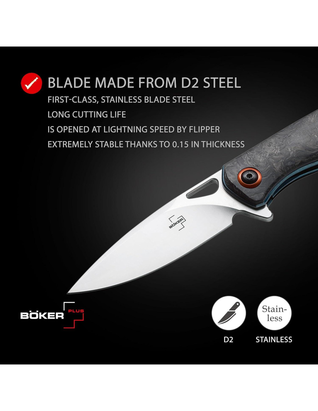 - ESPECIFICACIONES - cuchillo plegable de alta calidad, longitud de la hoja 9.19 cm (3.62 in), longitud total 21 cm (8.27 in), grosor 0.36 cm (0.14 in), peso 143.5 g (5.08 oz), hoja D2, mangos de fibra de carbono, alcance de entrega 1x cuchillo de bolsillo plegable, 1x funda