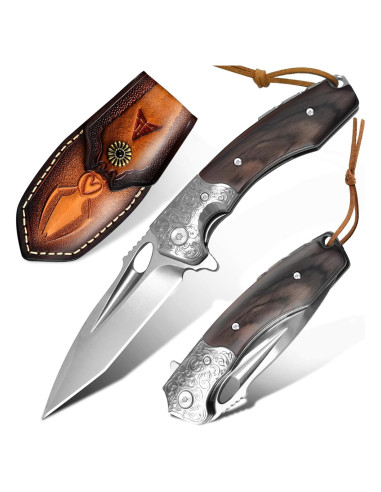 - Mango de ébano elegante y ergonómico. Experimenta comodidad y control con el mango de madera marrón águila bellamente elaborado. Diseñado con la ergonomía en mente, el cuchillo de caza plegable asegura un agarre seguro y antideslizante que minimiza la fatiga de la mano, incluso durante un uso prolongado. Compacto y ligero, este cuchillo EDC se desliza sin esfuerzo en tu bolsillo y viene con una funda de cuero premium. Es una herramienta poderosa envuelta en un paquete elegante y sofisticado.