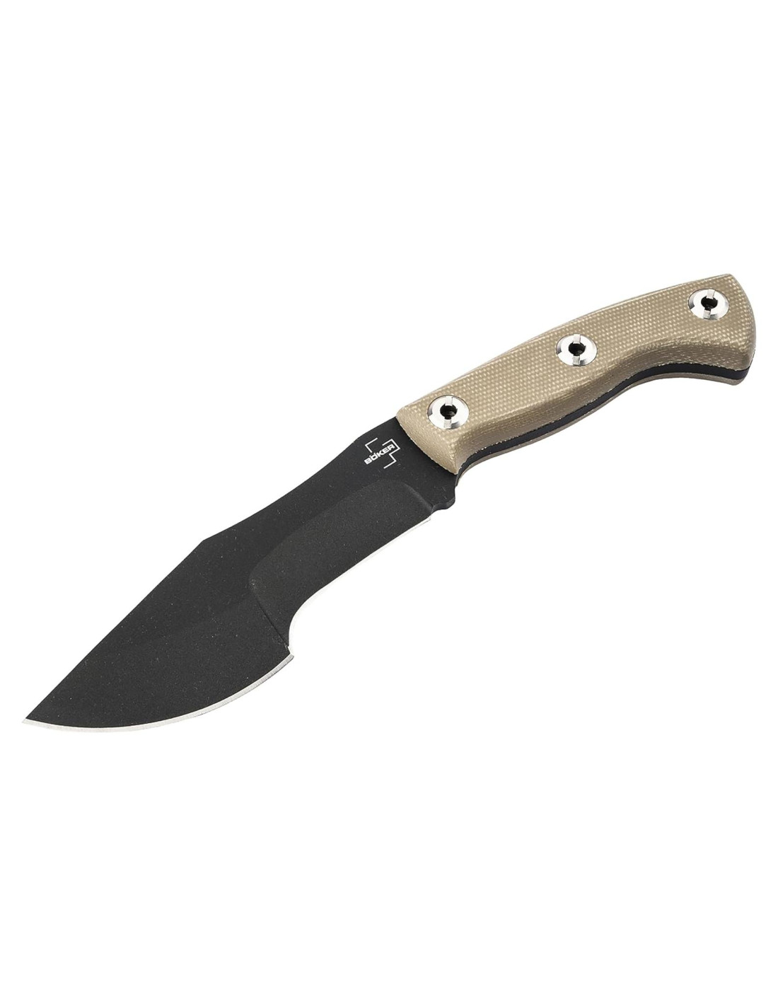 El Bker Plus Mini Tracker, diseñado por Dave Wenger, convence como un cuchillo de exterior extremadamente estable con una hoja masiva hecha de acero al carbono 1095, que cuenta con una excelente resistencia a la corrosión, gracias al recubrimiento en polvo resistente a la abrasión. Dave Wenger, de Michigan, desarrolló una apreciación por cuchillos, hachas y espadas desde pequeño, y siguió los pasos de su abuelo desde una edad temprana en su vida. Así es como el herrero de larga trayectoria se convirtió en el maestro de su inexperto pero extremadamente ambicioso nieto, quien ha estado diseñando y fabricando cuchillos a tiempo completo durante muchos años. La hoja de este sólido cuchillo de supervivencia tiene dos niveles de afilado diferentes y es ideal para picar, cortar, raspar, cavar y hacer palanca. El equilibrio óptimo del grosor y la longitud de la hoja, así como la forma ergonómica de los mangos de Micarta finamente texturizados, permiten un trabajo sin fatiga. Esta versión actualizada está equipada con una hoja de tang completo, sostenida por tornillos robustos, para una máxima estabilidad. Incluye un adaptador de cinturón y una funda Kydex ajustada con precisión.
