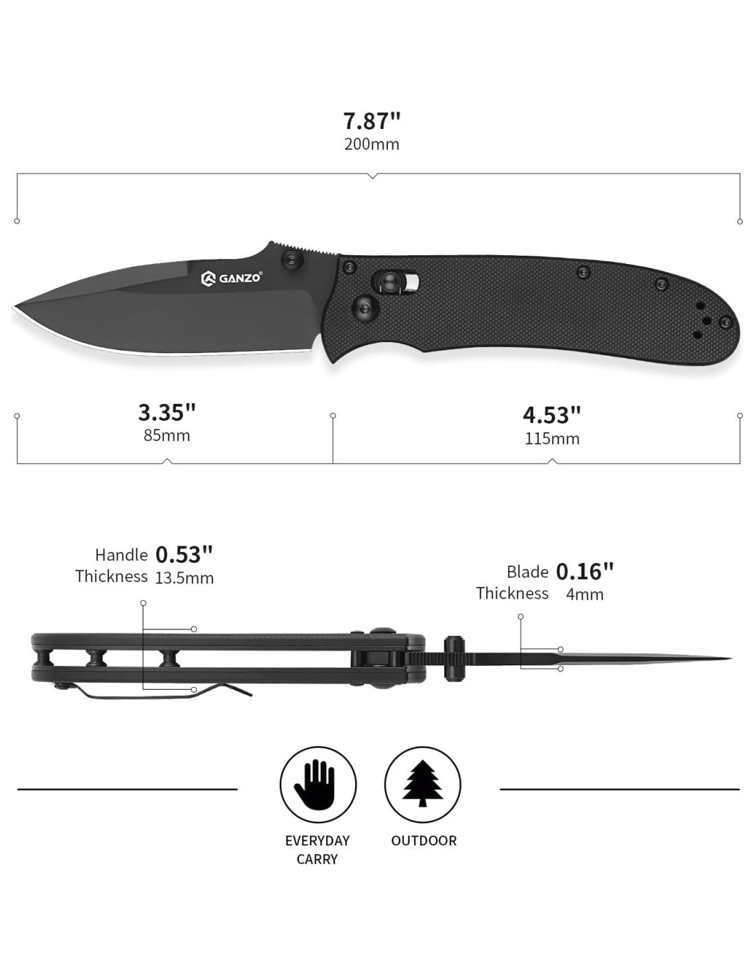 El modelo Ganzo G704B tiene todo lo que necesitas para un uso efectivo y conveniente tanto dentro de la ciudad como en el campo, por ejemplo, durante un viaje turístico, pesca o caza. Para abrir la estructura, se utiliza un botón de pulgar de doble cara. El bloqueo de pin Axis Lock proporciona seguridad al bloquear firmemente la hoja durante su uso. Una hoja con un perfil Drop Point, que se considera un clásico en cuchillos plegables, es responsable de un corte de alta calidad. La hoja recta corta a través de materiales de diversas densidades, mientras que la punta delgada puede perforar tela e incluso madera. Los troqueles en el mango están hechos de fibra de vidrio G10, que evita que la estructura se deslice en la palma debido a su superficie rugosa. Este compuesto soporta la exposición a temperaturas extremadamente bajas y altas y a influencias mecánicas a largo plazo. El material de la hoja es acero 440C, uno de los grados más populares que se encuentran en herramientas cotidianas. El metal es altamente resistente a la corrosión. El recubrimiento negro en la hoja tiene un efecto positivo en las características de resistencia del acero. Además, es una decoración del diseño.