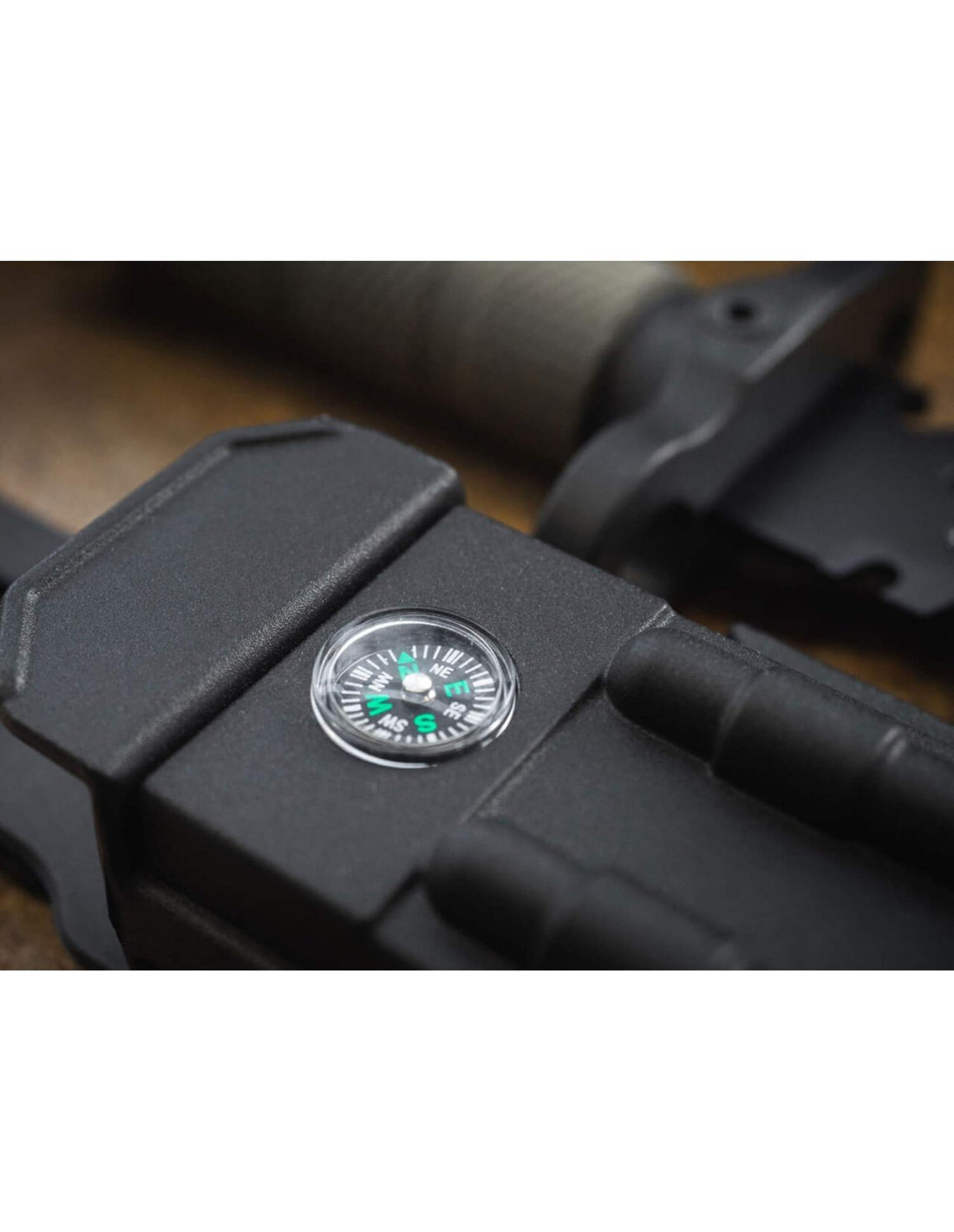 Los cuchillos de supervivencia completamente desarrollados como el cuchillo de supervivencia Magnum M-Spec fueron establecidos hace décadas por Jimmy Lile y se hicieron conocidos en todo el mundo a más tardar a través de la película Rambo en 1982. Por razones de estabilidad, sin embargo, el Magnum MSSK no está equipado con un controvertido mango hueco, sino que tiene un mango sólido hecho de FRN indestructible. Gracias al recubrimiento de goma verde oliva, el mango antideslizante siempre se sostiene de manera segura en la mano, incluso en condiciones húmedas, y el elemento de parry negro aumenta aún más la seguridad en el trabajo. La abertura en la guarda de la mano, que recuerda al anillo del cañón de una bayoneta, permite que el cuchillo se fije con cuerda, alambre, bridas o cinta adhesiva de tela, de modo que también se puede usar como una lanza improvisada, por ejemplo. La poderosa hoja Bowie hecha de acero inoxidable y elástico al impacto 7Cr17MoV está recubierta de negro y además equipada con la típica sierra en la parte posterior. La funda de plástico negro que se ajusta perfectamente ofrece una amplia gama de posibilidades de sujeción en ropa y equipo gracias a numerosas aberturas y está además equipada con una brújula incorporada así como un práctico iniciador de fuego. El lazo para el cinturón está diseñado como un clip integrado.