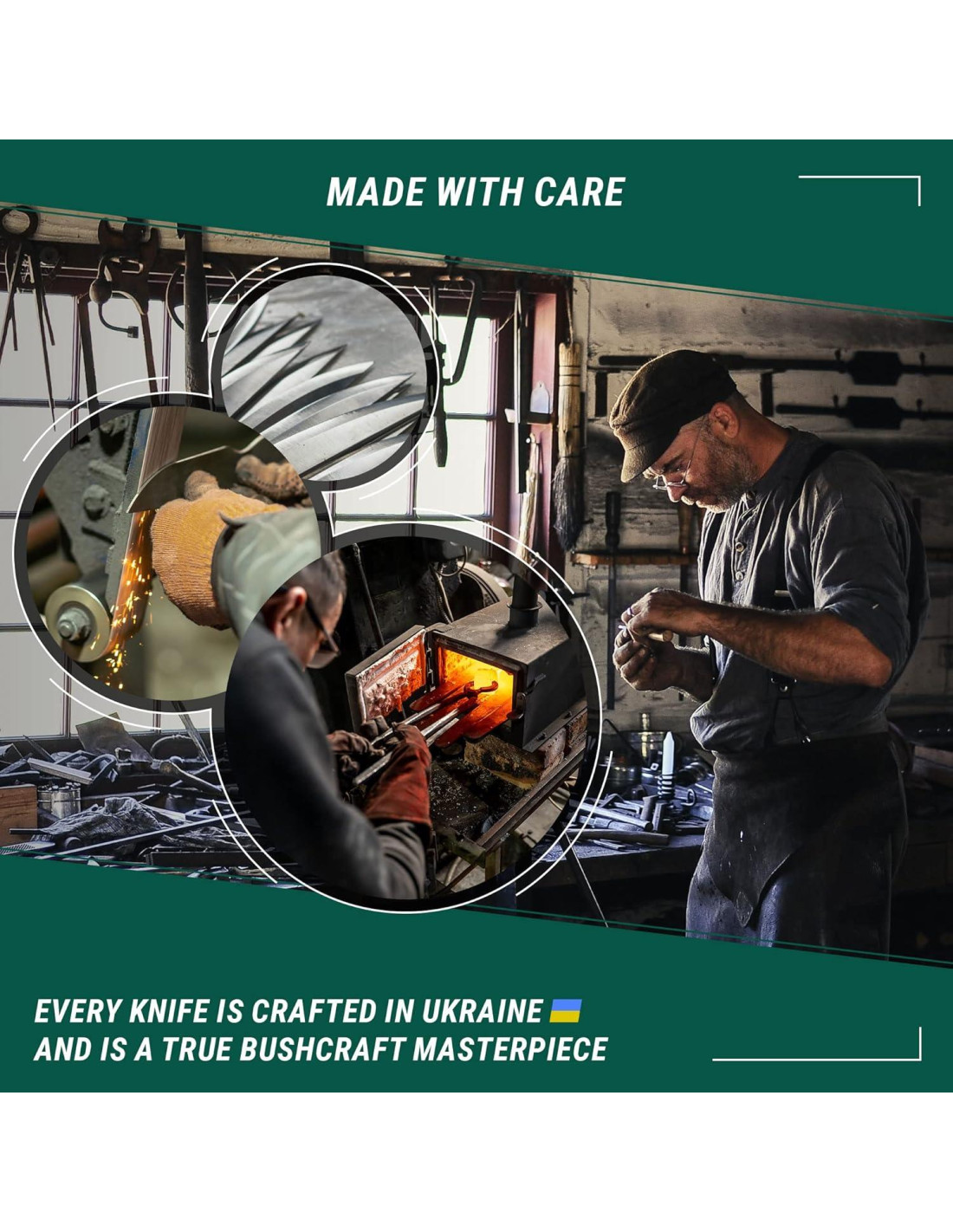 Experimenta la versátil capacidad de encendido de fuego del cuchillo BSH4F con la varilla de ferro incluida. Ya seas un experimentado amante de la naturaleza o un explorador novato, este cuchillo es una herramienta imprescindible. Fabricado en acero al carbono de alta calidad, este cuchillo viene afilado como una navaja directamente de la caja. La funda ofrece opciones fijas y libres, asegurando un ajuste seguro, con un lazo para la varilla de ferro. Su construcción robusta y diseño ergonómico garantizan un agarre cómodo y un manejo fácil. El cuchillo Bushcraft BSH4F es una excelente opción para aquellos que buscan un cuchillo de hoja fija de gran calidad que pueda soportar un uso intensivo en cualquier entorno al aire libre. Presenta un mango de nogal europeo de primera calidad que proporciona un agarre cómodo y seguro, permitiéndote abordar cualquier tarea de corte con facilidad. Su diseño ergonómico se adapta cómodamente a tu mano, reduciendo la fatiga durante un uso prolongado. La hoja del cuchillo está hecha de acero al carbono 1066 con una dureza de 58-60 HRC. Esto lo convierte en un excelente equipo de bushcraft que mantiene su afilado durante mucho tiempo, asegurando un alto rendimiento en cualquier situación. El grosor de la hoja de 3.5 mm (0.14 pulgadas) mejora la durabilidad del cuchillo, haciéndolo perfecto para trabajos al aire libre de alta resistencia. El recubrimiento metálico especial de la hoja la protege de la oxidación y la corrosión, aumentando su vida útil. El cuchillo Bushcraft BSH4F presenta una construcción de tang completo, proporcionando una fuerza, equilibrio y estabilidad superiores. Esto lo hace ideal para tareas desafiantes al acampar, hacer senderismo y sobrevivir en la naturaleza. La parte posterior de la hoja se puede usar para golpear la varilla de ferro incluida, generando chispas, esenciales para encender fuegos. Además, el jimping en la espina de la hoja ofrece tracción para tu dedo, asegurando un agarre seguro en el cuchillo. El cuchillo Bushcraft BSH4F cuenta con una funda de cuero genuino con accesorios de lazo para el cinturón y un lazo específico para la varilla de ferro, lo que lo hace fácilmente portátil. La funda protege la hoja de daños, manteniendo el cuchillo en condiciones prístinas. El conveniente agujero para un cordón de paracord facilita la sujeción del cuchillo a tu mochila o llevarlo en tus manos al viajar. No te pierdas la aventura al aire libre definitiva con el cuchillo Bushcraft BSH4F - tu compañero confiable y asequible. Esta hoja es un activo robusto y confiable para los entusiastas del aire libre. Ya sea que estés involucrado en artesanías en el bosque, acampando, tácticas de supervivencia o investigación en el campo, está equipado para manejar cualquier situación. Desde construir refugios hasta cocinar en la naturaleza, este cuchillo es tu aliado fiel en la naturaleza. ¿Cuál es la principal diferencia entre el cuchillo BSH4F y su modelo anterior? La principal diferencia entre este cuchillo y su modelo anterior es que el BSH4F Dusk incluye una varilla de ferro, mejorando su utilidad para tareas de supervivencia al aire libre. ¿Cuál es el material del mango del cuchillo BSH4F? El material del mango del cuchillo BSH4F es nogal europeo. ¿Cuántos sujetadores aseguran el mango del cuchillo BSH4F? El mango del cuchillo BSH4F está asegurado con tres sujetadores, que pueden ser reemplazados si es necesario. ¿Cómo están diseñadas las fundas del cuchillo BSH4F? El cuchillo BSH4F Dusk tiene suspensiones fijas y desmontables y se puede asegurar a un sujetador de funda. El lazo para la varilla de ferro lo mantiene a mano en todo momento. ¿Cuál es el propósito del cuchillo BSH4F? El cuchillo BSH4F está diseñado para bushcraft, supervivencia, caza, hacer chispas con un encendedor y turismo. El cuchillo bushcraft BSH4F, hecho a mano en Ucrania, está forjado en acero al carbono con un recubrimiento galvánico para prevenir la oxidación. Su mango de nogal europeo tiene tres sujetadores intercambiables e incluye una varilla de ferro para encender fuego. Cuchillo de tang completo con borde falso, muescas en la espina, tres sujetadores para estabilidad y un agujero para cordón de paracord. Funda de cuero genuino con suspensión fija y desmontable, sujeción para cinturón y lazo para varilla de ferro. Cuchillo Bushcraft BSH4F Cuchillo Bushcraft BSH1 Cuchillo Bushcraft BSH3 Caja de Regalo Disponible Caja de Regalo Disponible Caja de Regalo Disponible Peso del Artículo 10.6 onzas (300 gramos) Peso del Artículo 9.9 onzas (280 gramos) Peso del Artículo 9.8 onzas (278 gramos) Longitud del Artículo 9.8 pulgadas (24.9 cm) Longitud del Artículo 10.6 pulgadas (26.9 cm) Longitud del Artículo 9.6 pulgadas (24.4 cm) Funda de Cuero Disponible Funda de Cuero Disponible Funda de Cuero Disponible Afilados de la Hoja Sabre Afilados de la Hoja Afilado Scandi Afilados de la Hoja Sabre