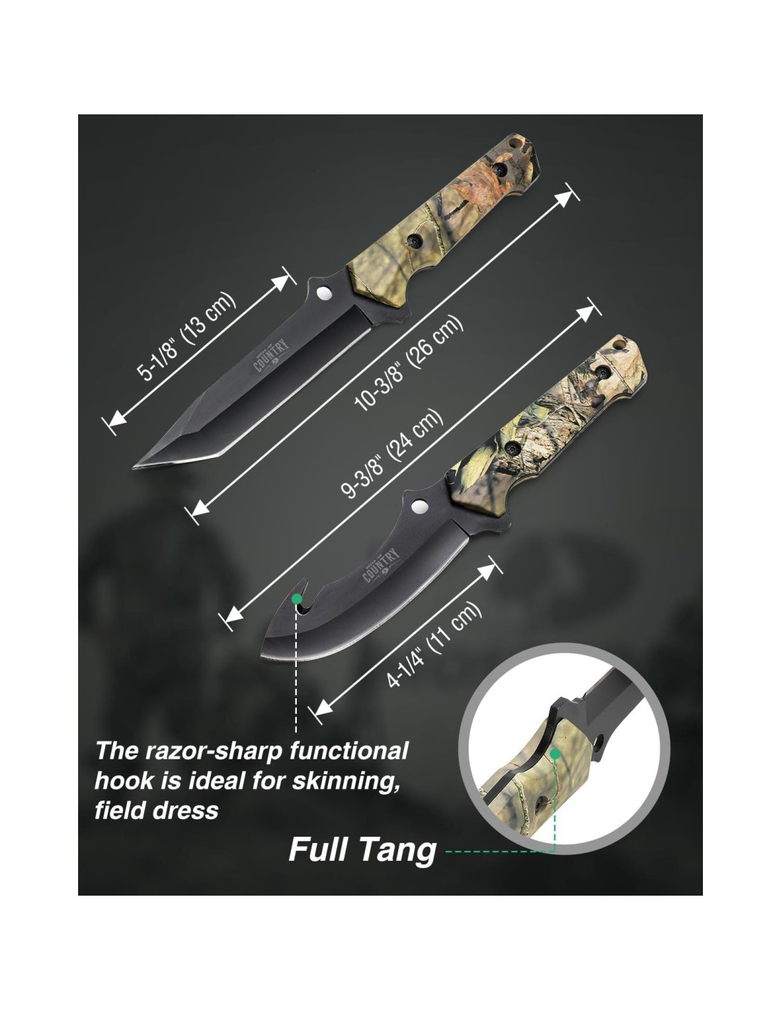 - Componentes incluidos: 2 Piezas de Cuchillo de Caza de Hoja Fija con Funda