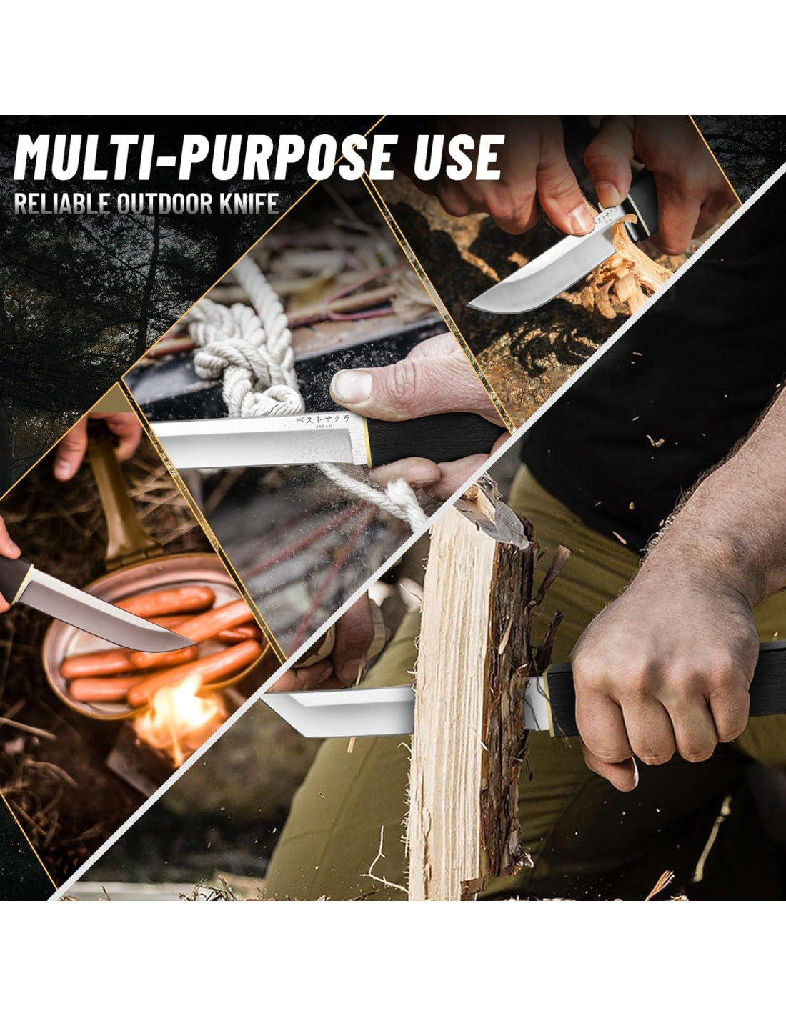 - Hoja de acero inoxidable premium: Fabricada con acero inoxidable 5CR15MOV con una dureza de 57HRC, la hoja ofrece afilado y resistencia. El espesor de 4mm en la espina mejora su durabilidad, asegurando un rendimiento confiable en condiciones al aire libre