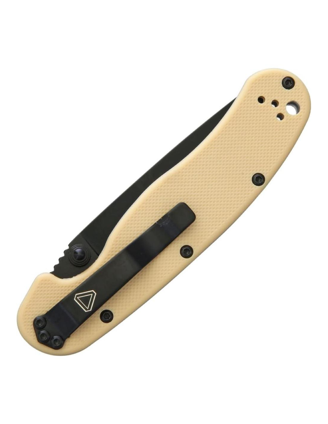 10.16 cm cerrado. 7.62 cm hoja de acero D2 con acabado negro en forma de punta de gota. Mango G10 color tan desierto. Clip para bolsillo. Botón de pulgar. Orificio para cordón. En caja.