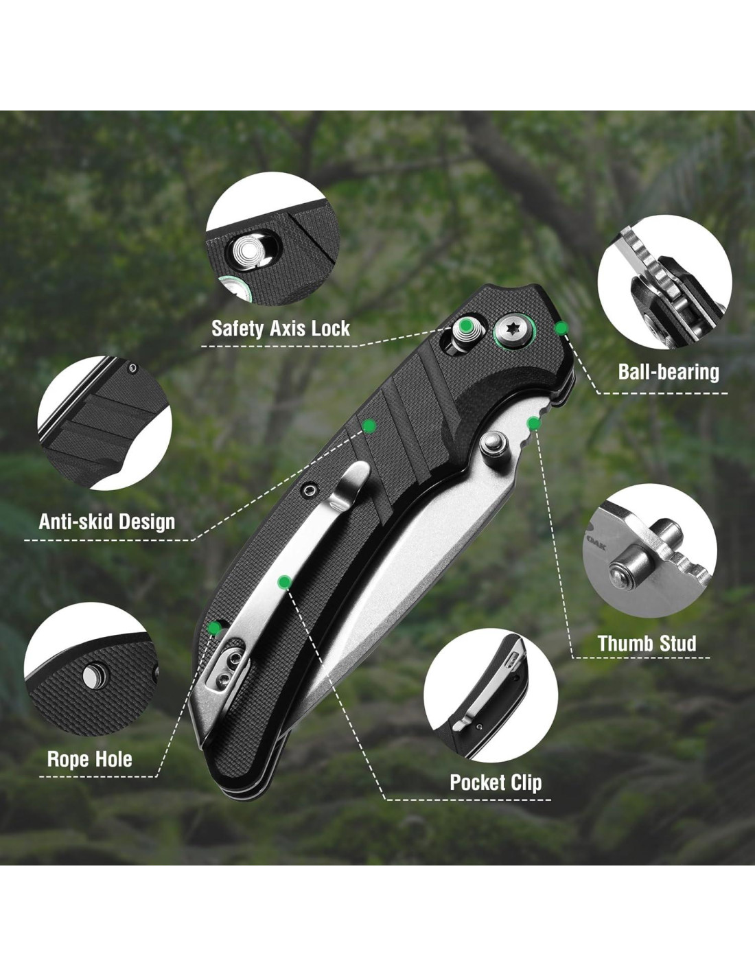 - MECANISMO DE BLOQUEO DE EJE SEGURO- Por razones de seguridad, este cuchillo EDC de 4" (10,16 cm) está equipado con un bloqueo de eje. El cuchillo se puede abrir fácilmente simplemente girando el botón de pulgar. El bloqueo de eje no se cerrará accidentalmente. Además, el clip para bolsillo y el orificio para cordón ofrecen múltiples opciones de transporte.