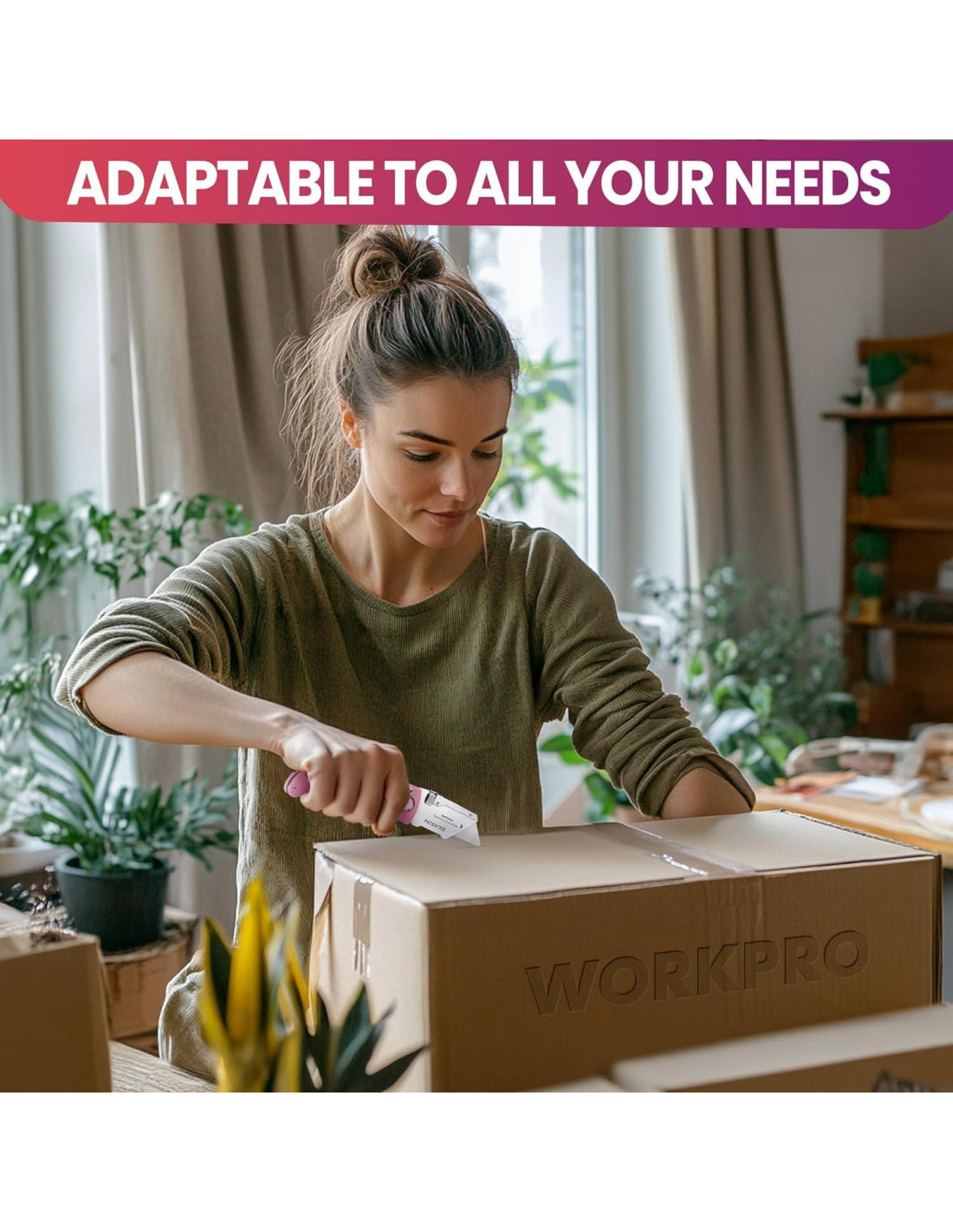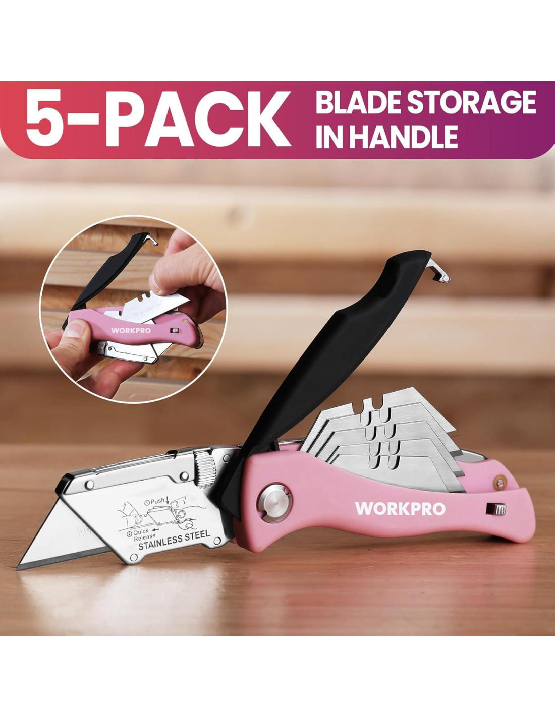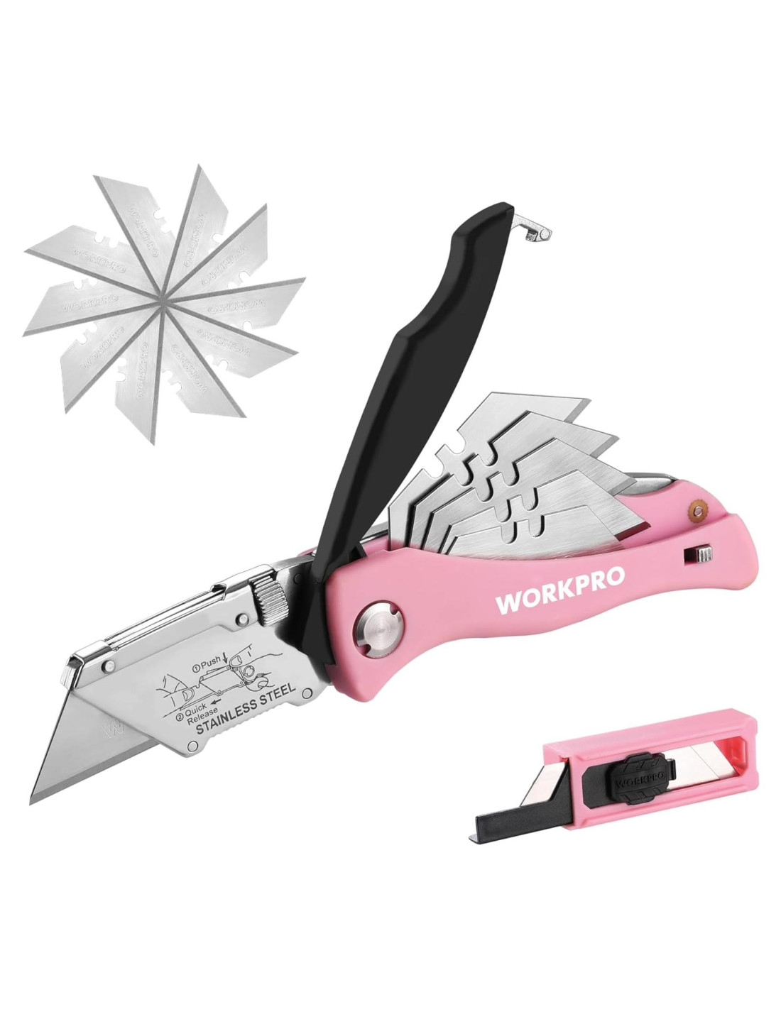- Varias Aplicaciones: Este cuchillo utilitario está construido para durar, puede ser ampliamente utilizado para el hogar, oficina, taller y proyectos de bricolaje. El cuchillo utilitario rosa WORKPRO corta papel, cartones, tela, cuero, PVC, cuerda, alfombra, paneles de yeso y mucho más. Realiza más trabajo con nuestro resistente cuchillo cortador de cajas