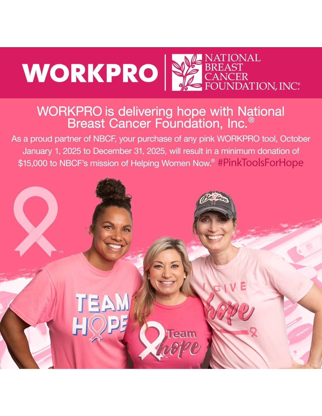 - Cinta Rosa - WORKPRO Tools está donando de esta compra a la Fundación Nacional del Cáncer de Mama, INC. NBCF está Ayudando a las Mujeres Ahora al proporcionar detección temprana, educación y servicios de apoyo a quienes se ven afectados por el cáncer de mama