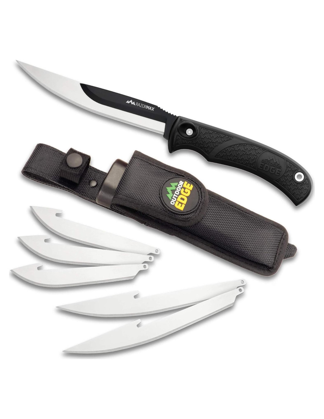 El Sistema RazorSafe combina el rendimiento quirúrgico con la conveniencia de un cuchillo de caza, para una familia de cuchillos de caza con hojas reemplazables, afiladas y fuertes, disponibles, con hojas que cambian de forma segura y fácil con solo presionar un botón. El soporte de hoja recubierto de óxido negro soporta la hoja de afeitar para la resistencia de un cuchillo tradicional y la agudeza de un escalpelo de cirujano. Elige entre varios cuchillos diseñados para satisfacer tus necesidades de caza. Diferentes estilos de hoja trabajan en conjunto para desollar, pelar, deshuesar y preparar venado fresco en porciones familiares, todo con una familia de cuchillos que nunca necesita afilarse.