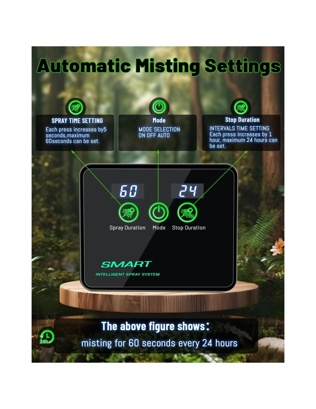 - [Humidificador Inteligente con Pantalla LED y Temporizador] Solo 3 botones para configurar el nebulizador para reptiles. Botón de modo: elija un rociado regular o automático. Duración del rociado: configure el tiempo de rociado de 5s, 10s, 15-60s, así en ciclo. Duración de parada: configure el tiempo de parada en cada ciclo de rociado, de 1h, 2h, 3h-24h, así en ciclo. Una vez que se establece el temporizador, la configuración se almacena automáticamente en el nebulizador para reptiles. No es necesario restablecer el temporizador cada vez que reinicia la energía del dispositivo. Pantalla LED, fácil de leer.