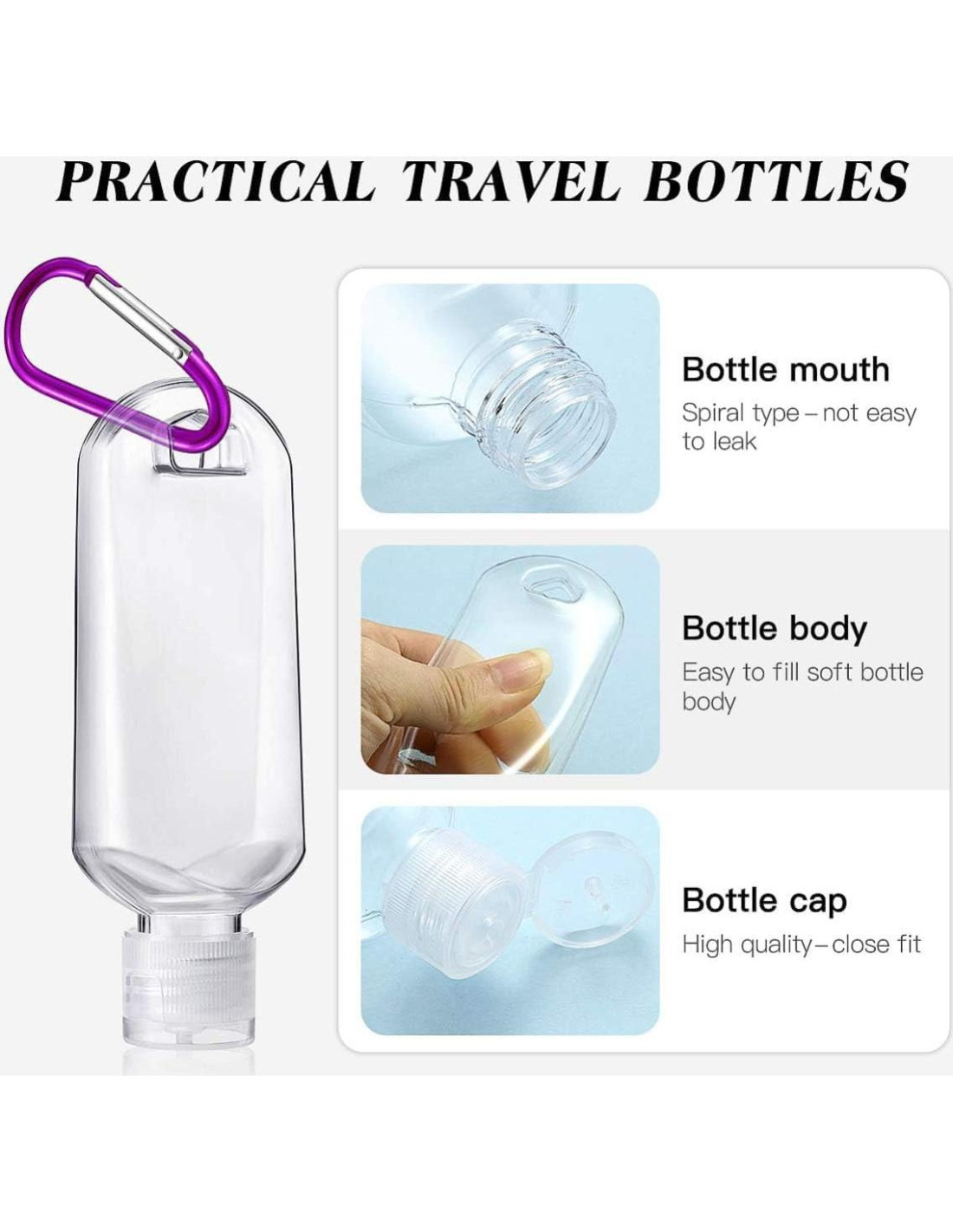 - [SEGURIDAD Y CALIDAD PREMIUM] Las botellas de llavero de viaje están hechas de material PET transparente libre de BPA, inodoro, seguro, ligero, duradero y reutilizable.