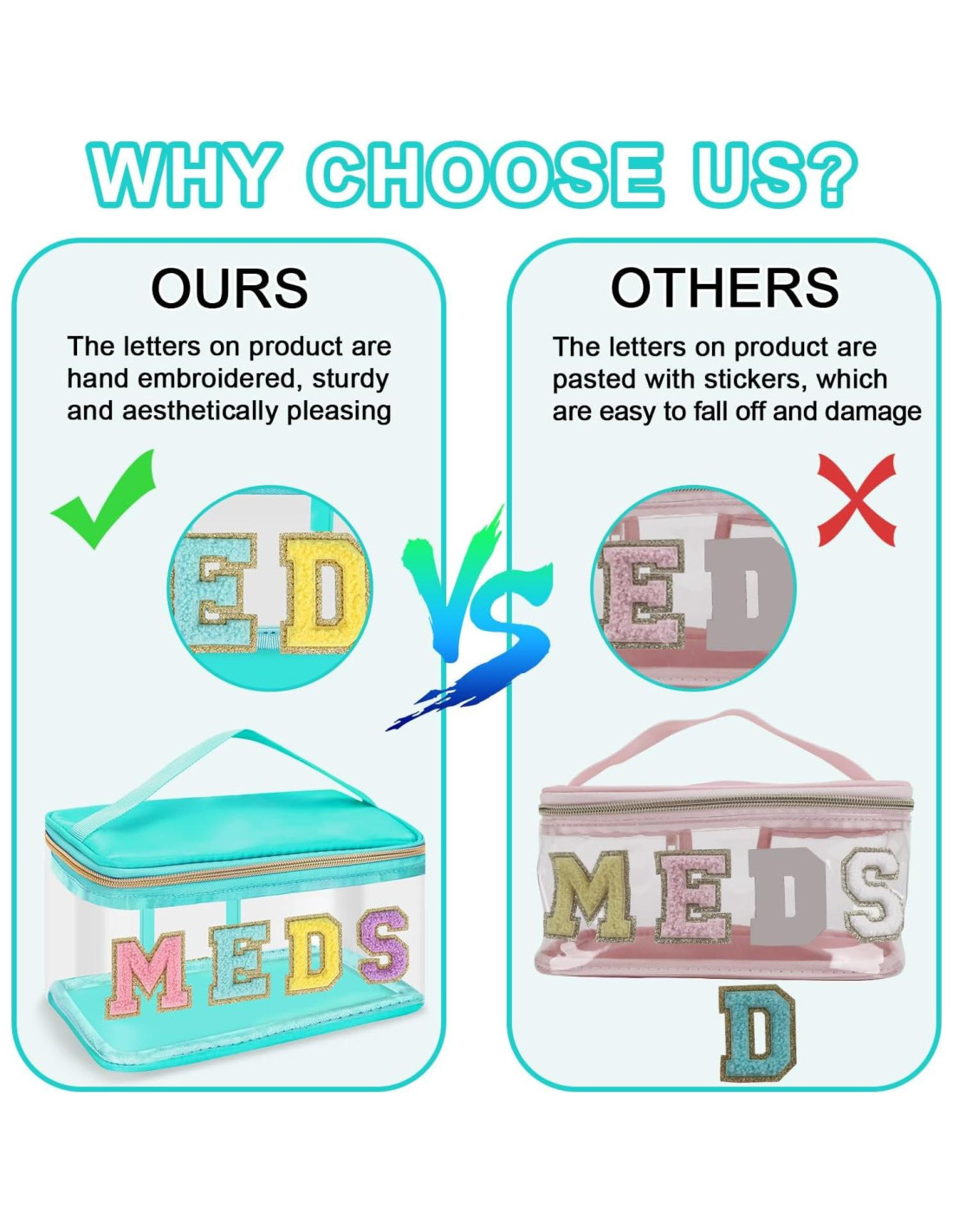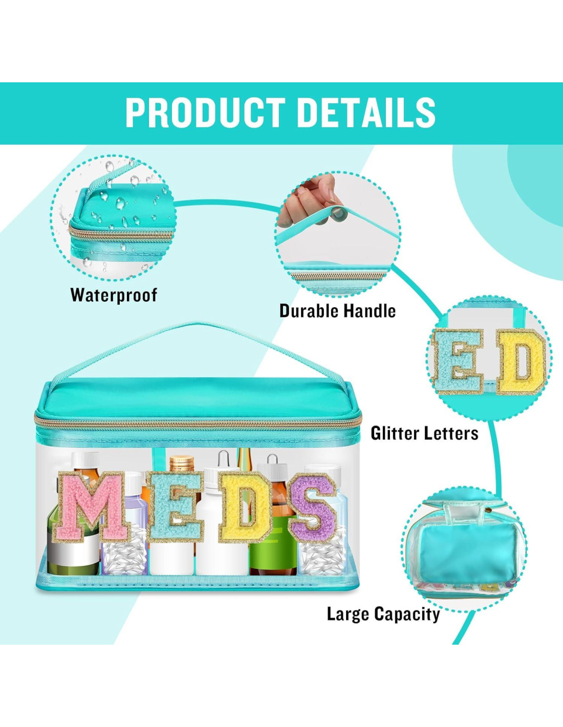 - Amplia Aplicación: La bolsa de parche de letras de chenille está especialmente diseñada para productos medicinales, puede almacenar todos los cuidados de medicamentos, cosméticos y otras cosas que necesitas para el uso diario. Suficientemente grande para llevar teléfonos móviles, cargadores portátiles, billeteras, llaves, gafas de sol, cosméticos, etc. Adecuada para estadios, arenas, partidos de fútbol, cualquier evento deportivo, fiestas, etc.