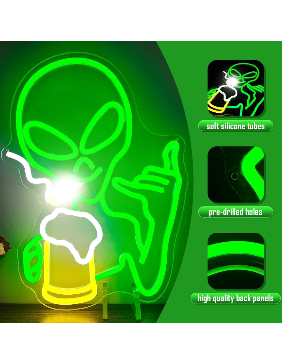 - FÁCIL DE INSTALAR: El letrero de neón alienígena para pared es fácil de instalar y de uso amplio, lo que lo hace perfecto para jugadores y entusiastas de la ciencia ficción. Especialmente tiene dos agujeros para colgar, que se pueden colgar fácilmente en paredes o puertas como decoración. También puedes poner los letreros de neón de bar en la mesa o en otro lugar