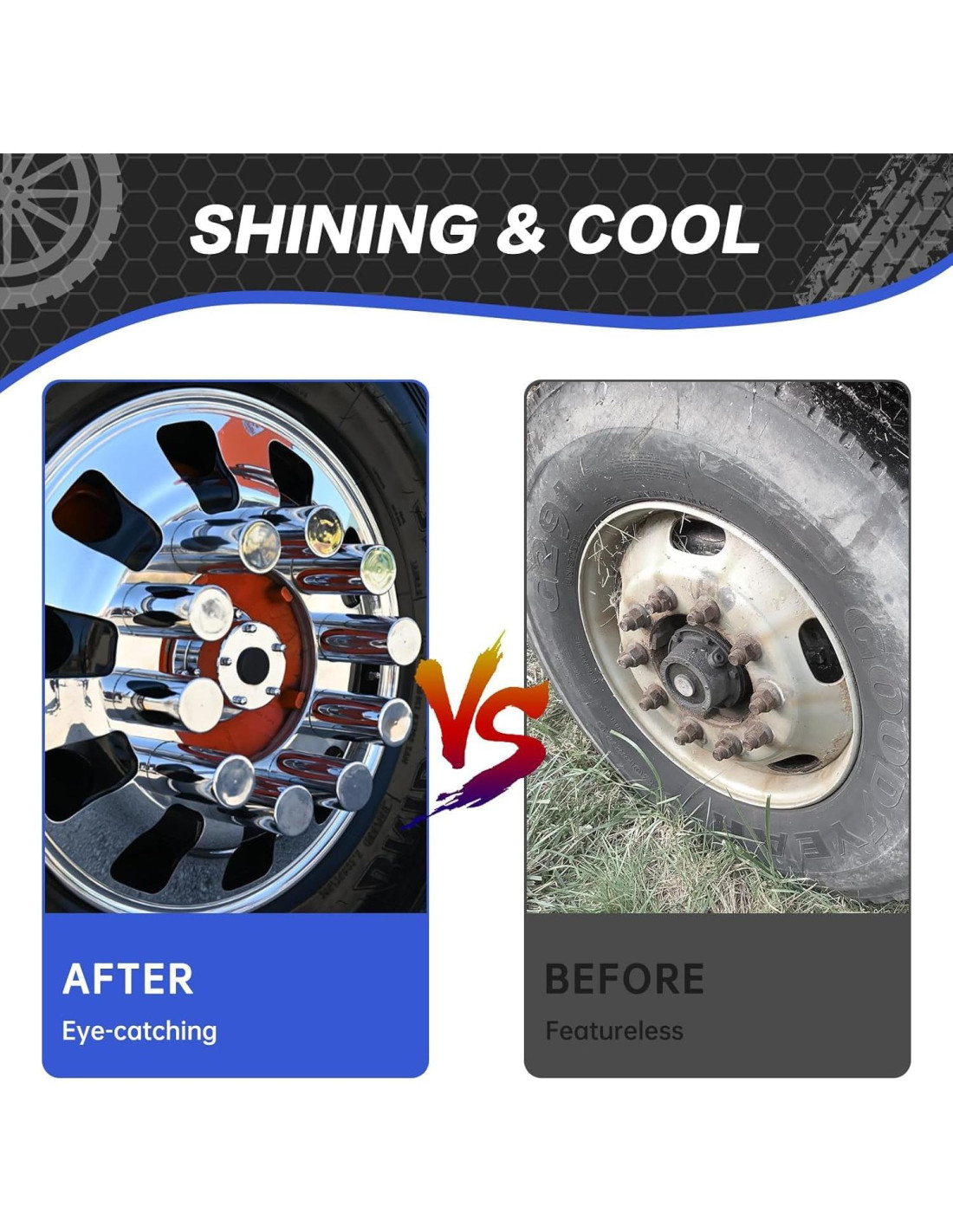 - APARIENCIA ESPEJADA Y MODERNA: El acabado cromado hace que las cubiertas de tuercas de rueda parezcan un espejo y llamativas, mejorando la apariencia de su vehículo. La superficie espejo está multicapa: 1 capa de Níquel + 1 capa de Cobre + 1 capa de Níquel Semi-Brillante + 1 capa de Cromo Brillante. Estas cubiertas de tuercas de camiones semi añadirán un toque de elegancia a su viaje