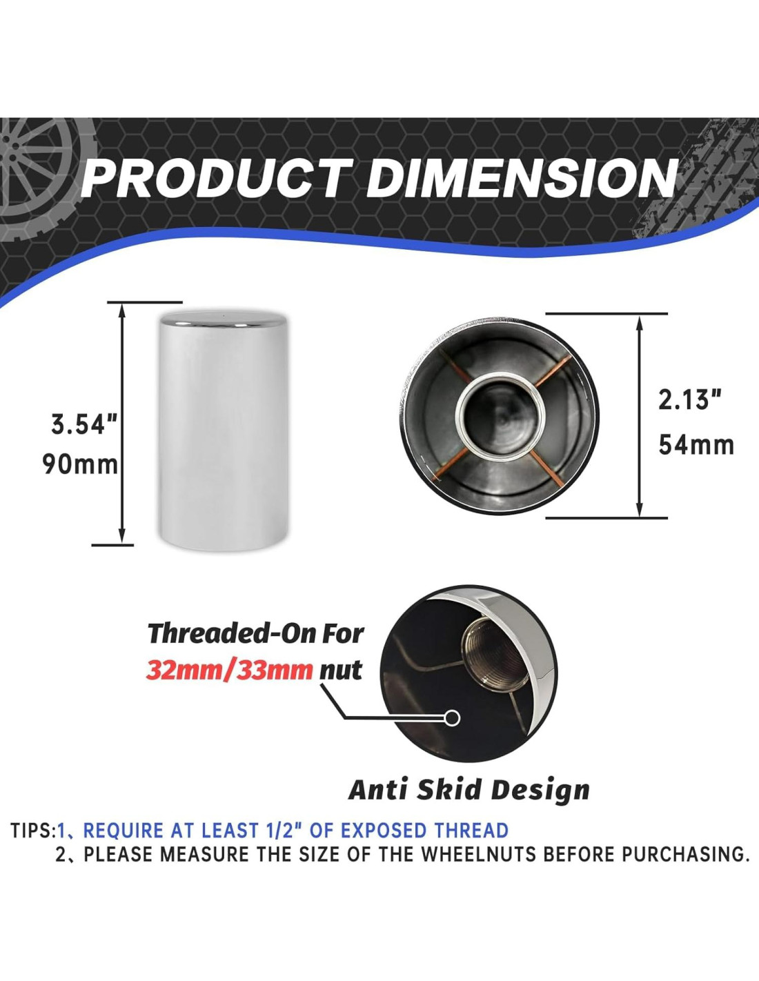 - AJUSTE PERFECTO PARA TUERCAS DE 32/33MM: 1 1/4"(32mm) y 1 5/16"(33mm) las cubiertas de tuercas de rueda se ajustan a la mayoría de los camiones semi Volvo (VNL), Peterbilt, Kenworth, Mack, Western Star, Freightliner (Cascadia, Columbia, M2, FLD). Por favor, mida y verifique el tamaño de sus cubiertas de tuercas de rueda antes de comprar