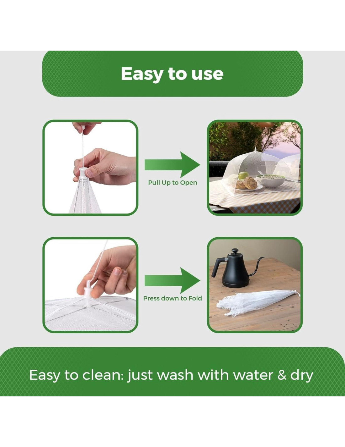 - Cubierta Reutilizable: La cubierta de red para alimentos es ideal tanto para uso exterior como interior. Plegable y reutilizable, es fácil de limpiar: solo enjuaga con agua y deja secar al aire. Una solución conveniente para mantener tu comida protegida
