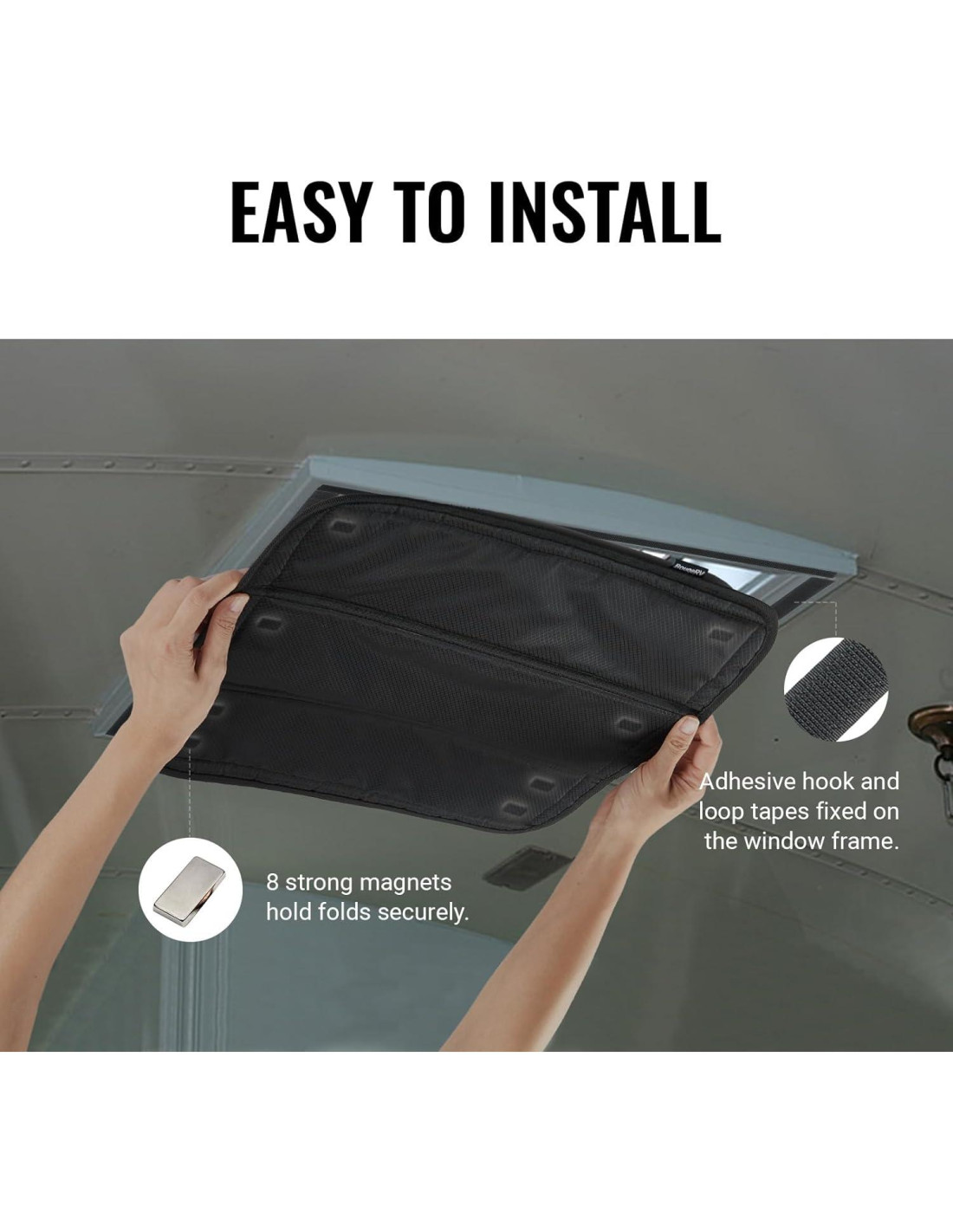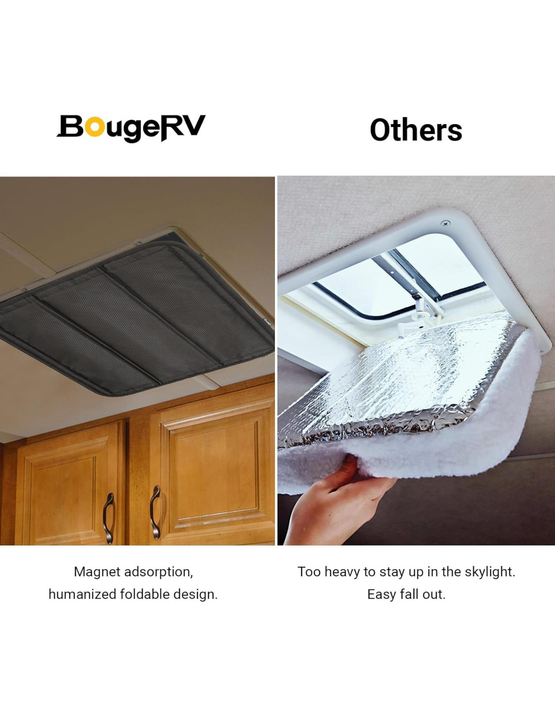 - Diseño Magnético Plegable Patentado en EE. UU.: La cubierta de ventilación RV BougeRV utiliza cintas de gancho y bucle y un potente imán. Los paneles se pueden plegar hacia arriba o hacia abajo para permitir/bloquear la luz. Los imanes son lo suficientemente fuertes como para asegurar la sombra cuando está plegada.