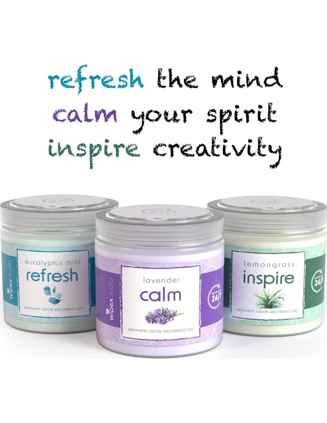 Mantén una atmósfera fresca y acogedora con los Tarros de Gel Absorbente de Olores Wipex. Ofreciendo tres fragancias distintas: Inspirar Hierba Limón, Refrescar Eucalipto y Menta, y Calmar Lavanda. Cada tarro está diseñado para neutralizar y eliminar olores persistentes, convirtiéndolo en una solución ideal para usar como eliminador de olores en habitaciones. La avanzada tecnología de gel combate eficazmente olores fuertes, proporcionando una solución integral de eliminación de olores para tu estudio, hogar, negocio o cualquier entorno cerrado. Eucalipto Menta Lavanda Hierba Limón Refrescar Eucalipto Menta ofrece un aroma fresco y refrescante con notas de menta fresca. Calmar Aroma de lavanda calmante que tranquiliza la mente, alivia la ansiedad y promueve la paz. Inspirar El aroma de hierba limón es fresco, picante y estimulante, despertando la creatividad. Frescura Duradera dura de 60 a 90 días Frescura Duradera dura de 60 a 90 días Frescura Duradera dura de 60 a 90 días Absorción de Olores áreas de hasta 41.81 metros cuadrados Absorción de Olores áreas de hasta 41.81 metros cuadrados Absorción de Olores áreas de hasta 41.81 metros cuadrados