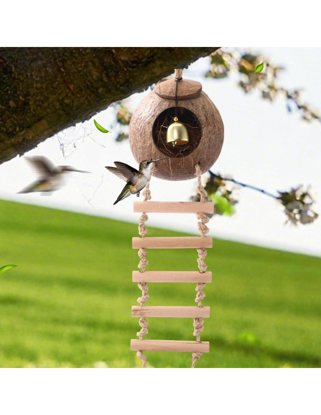- Cáscara de Coco con Escaleras y Campana: nido de aves de cáscara de coco con cuerda de cáñamo gruesa, fácil de colgar en interiores o exteriores; Se puede colgar en una rama o en cualquier lugar que desees, escalera de cinco etapas, cuerda de cáñamo, resistente y duradera, adecuada para mascotas pequeñas como loros