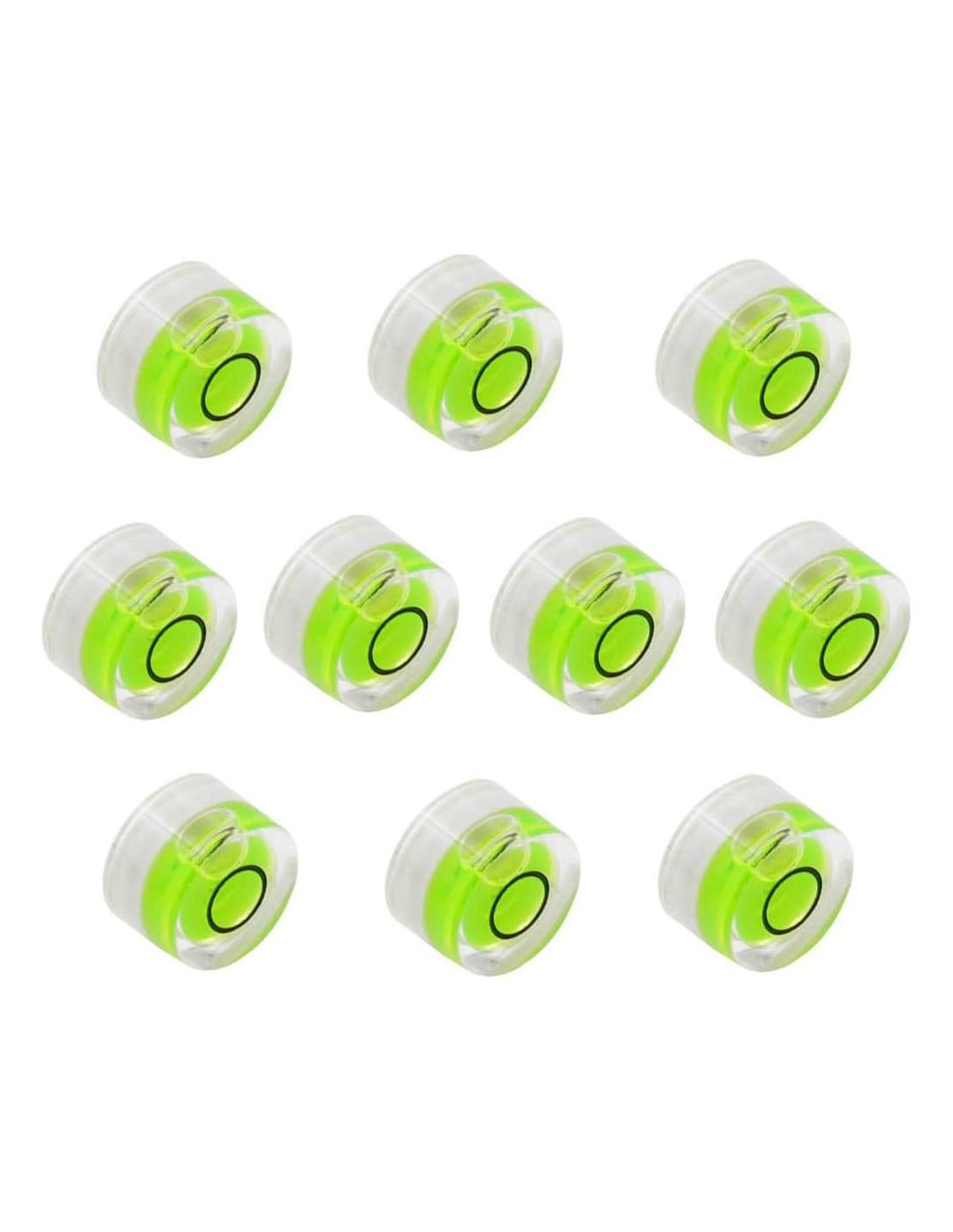 WOYISEPG 10Pcs Niveles de Burbuja Mini Circulares Nivel de Burbuja Bullseye Nivel de Burbuja Redondo Pequeño Herramientas de Medición de Diseño (10x6mm, No Adhesivo) Nivel de burbuja circular redondo de 10x6mm. Material: Acrílico. Tamaño: 10mm x 6mm (Diámetro x Altura) = 1cm x 0.6cm = 1.0cm x 0.6cm = 0.393 pulgadas x 0.236 pulgadas. Color: Verde fluorescente. Color de la línea de división: Negro. Paquete Incluido: 10 Piezas x Niveles de Burbuja Pequeños. No tiene adhesivo en la parte inferior, se puede usar cinta adhesiva de doble cara para fijarlo en muchos lugares. Nivelación tanto para uso profesional como normal. Diseñado para nivelar superficies en todas las direcciones, para nivelar máquinas, electrodomésticos, equipos, etc. Instrumento de medición redondo de nivel de burbuja mini circular universal.
