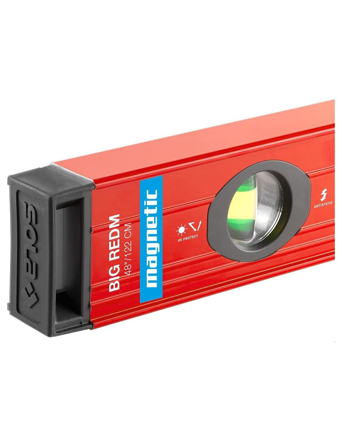 El nivel magnético de viga de caja SOLA de 122 cm ofrece un fuerte perfil de aluminio (890 G/M de resistencia) con dos tapas de extremo que absorben impactos para proteger el nivel en caso de caída o choque. Instalación de imán lateral para una superficie de medición continua y máxima protección de los imanes. Las tapas de extremo están equipadas con una superficie antideslizante, lo que permite una colocación conveniente y un agarre seguro a la superficie de medición. El vial de acrílico FOCUS resistente a roturas con 60% de aumento también ofrece un respaldo luminoso para condiciones de poca luz. El líquido del vial no se ve afectado por la electricidad y no se desvanecerá bajo la luz solar. Tolerancia de medición posición estándar: <0.3 mm/m (0.017), posición invertida <0.5 mm/m (0.029). Hecho en Austria.