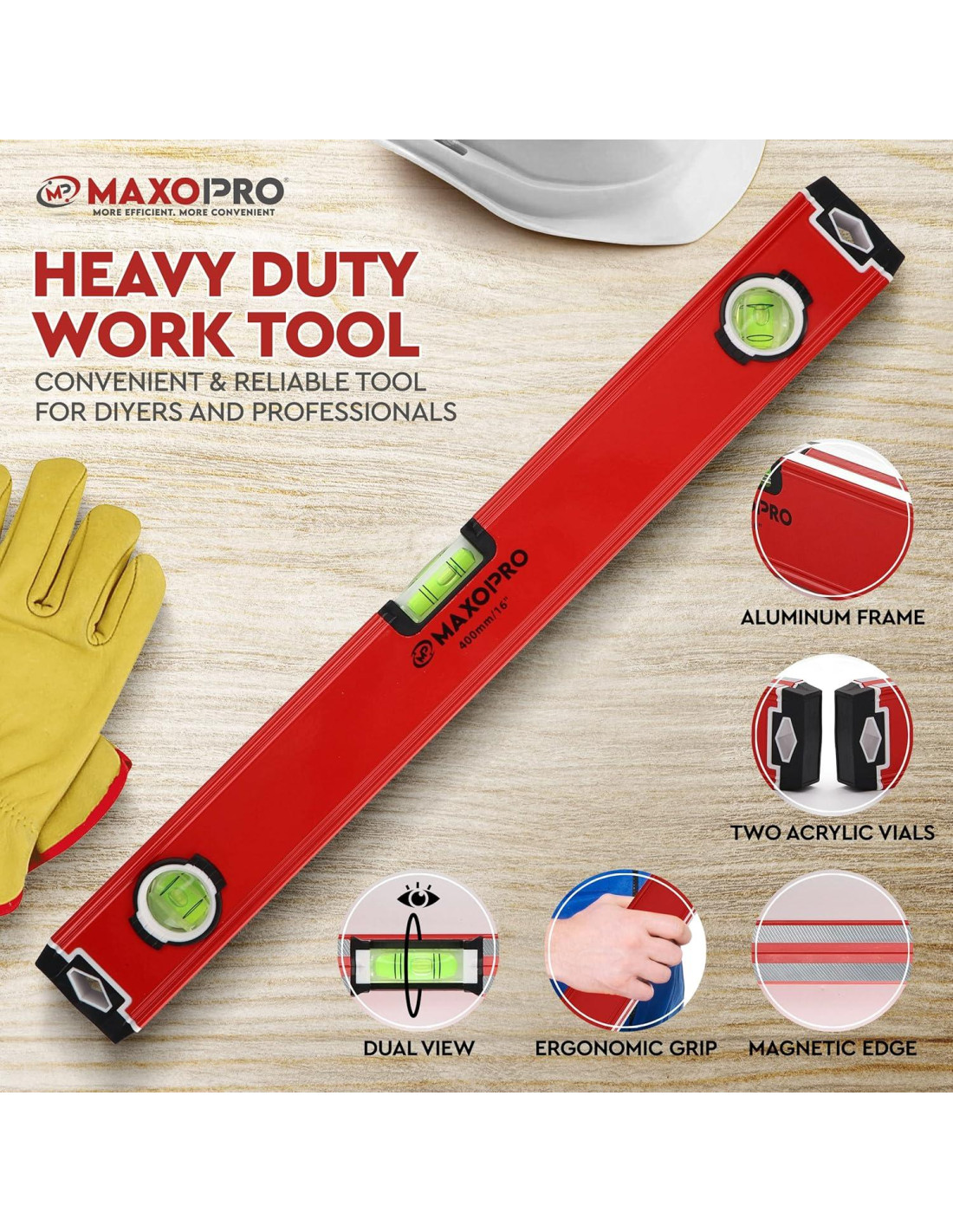 El equipo de MaxoPro entiende las necesidades de los clientes estadounidenses, se esfuerza por satisfacer esas necesidades con su compromiso de proporcionar herramientas de alta calidad. La dedicación de MaxoPro al enfoque en el cliente es evidente por nuestro servicio y soporte excepcionales, convirtiéndolo en una marca de referencia para herramientas confiables y de alta calidad. Para sus inquietudes y preguntas, no dude en ponerse en contacto con el equipo. Los productos de MaxoPro están diseñados y fabricados con precisión y durabilidad en mente, asegurando que los clientes reciban herramientas que están hechas para durar. Este vial de bloque central de nivel de burbuja es una característica destacada, ya que proporciona una excelente visibilidad y mediciones precisas. La magnificación le permite leer fácilmente la burbuja y hacer los ajustes necesarios, asegurando que sus mediciones sean precisas y exactas. Los bordes de esta herramienta niveladora de caja están cubiertos con protección de goma TPR, que asegura protección contra cualquier daño resultante de impactos y caídas. Además, viene equipada con tapas de goma absorbentes de impactos que absorben cualquier choque y proporcionan protección adicional contra daños. El nivel de torpedo viene equipado con potentes imanes que permiten fijarlo fácilmente a cualquier superficie metálica. Esta característica asegura que el nivelador permanezca estable durante su uso y libera sus manos para concentrarse en la tarea adicionalmente. Los imanes facilitan la observación de la posición horizontal, asegurando que obtenga resultados precisos y confiables.