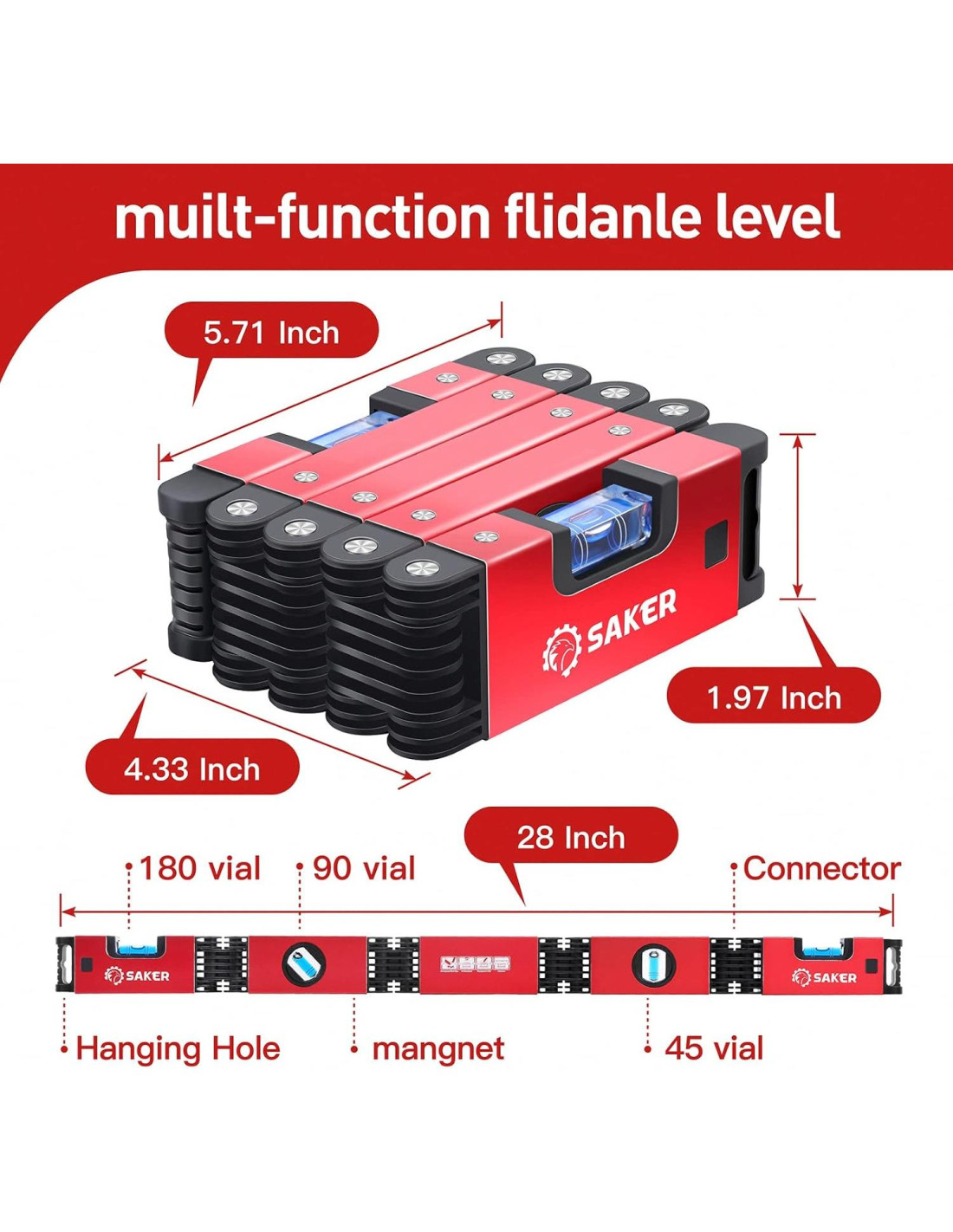 - AMPLIA APLICACIÓN: La herramienta nivel plegable Saker ofrece una flexibilidad y versatilidad excepcionales, lo que la convierte en una solución ideal para una amplia gama de tareas de medición y nivelación. Esta herramienta niveladora Saker con bisagra le permite plegarla a cualquier ángulo para sortear obstáculos y medir múltiples ángulos simultáneamente, como para tuberías, escaleras y esquinas, plegar o extender para usar está disponible. Es una herramienta de carpintería de nivel plegable multifuncional.